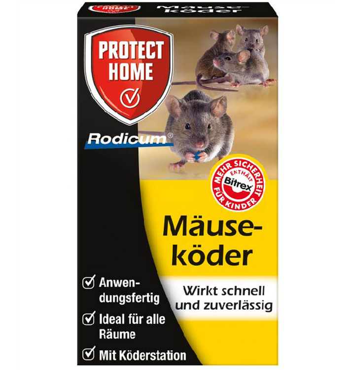 Zur schnellen Bekämpfung von Mäusen in Wohnbereichen, Dachböden, Waschküchen, Gartenlauben, etc. für nichtberufsmäßige Verwender. Anwendungsfertig, mit kindersicherer Köderbox.