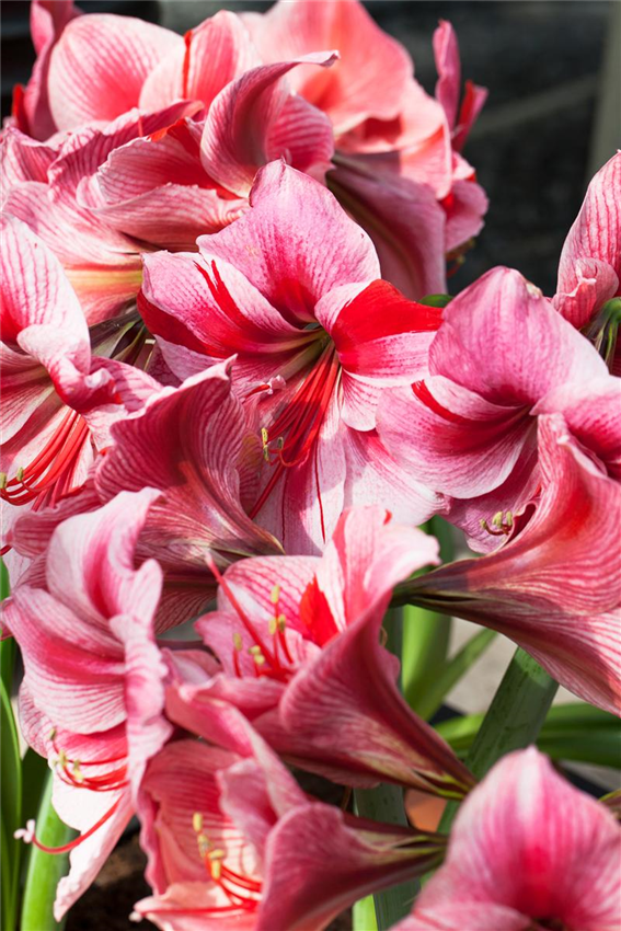 Hippeastrum Waxz® Auch wenn die Amaryllis verblüht, kann man sie noch weiter pflegen. Pflanzen im Glas müssen dafür in einen Topf umgepflanzt werden. Dabei sollte noch ein Drittel der Zwiebel aus der Erde ragen. Entfernen Sie die verwelkten Blüten und stellen Sie die Pflanze an einen hellen, warmen Platz. Gießen Sie regelmäßig. Außerdem können Sie die Pflanze alle 2 Wochen düngen. Nach dieser Wachstumsphase ist es an der Zeit, die Pflanze an einen halbschattigen Platz im Freien zu stellen. Das ist etwa ab Mitte Mai oder Juni möglich, wenn kein Frost mehr droht. Dann müssen Sie regelmäßig düngen und gießen. In dieser Zeit werden in der Zwiebel die neuen Blüten angelegt. Ab August stellen Sie das Gießen aber wieder ein und lassen das Laub verwelken. Die vergilbten Blätter entferne Sie, bevor Sie die Zwiebeln austopfen und an einem trockenen, dunklen Ort lagern. Das ist die Ruhephase. Mitte November kommen die Blumenzwiebeln wieder in den Topf. Dann haben Sie auch beim nächsten Weihnachtsfest wieder Freude an der floralen Dekoration!