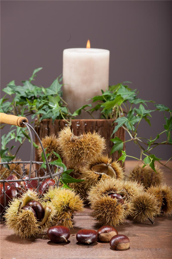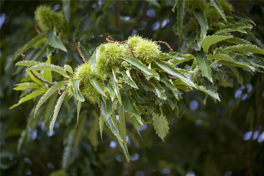 Castanea sativa Während die Kastanienbäume in unseren Breiten wie alle Laubbäume im Winter kahl aussehen, bringen sie im Frühling nicht nur ihr Laub erneut hervor, sondern auch eine ganz besondere, an Kerzen erinnernde Blüte. Im Sommer gelten vor allem große und alte Bäume als idealer Schattenspender, weshalb oft unter den Kastanien Bänke gebaut oder aufgestellt wurden. Das bunte Laub im Herbst ist ebenfalls eine Augenweide. Viele der Kastanienbäume, die man heute in Anlagen sieht, sind um die 100 Jahren alt. Sie brauchen lange, ehe sie zu einem stattlichen Baum herangewachsen sind. In den ersten 30 Jahren wächst die Kastanie etwa 10 Meter. Doch sie kann bis zu 30 Metern Höhe erreichen, und bis 200 Jahre alt werden. Besonders häufig gepflanzt wurden sie vor Jahrzehnten auf den Schulhöfen der Dorfschulen, um den Kindern Freude an den Früchten zu machen und deren Fantasie anzuregen, da man mit den dunkelbraun glänzenden Kastanien herrlich basteln kann. Leider behalten sie beim Trocknen diese nicht bei, sondern werden kleiner und glanzlos. Dennoch sind sie äußerst beliebt.