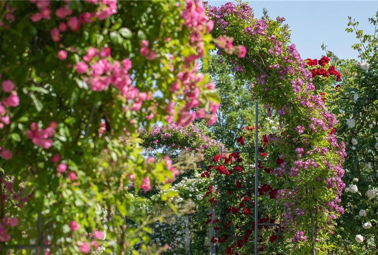 Kletterrose, rot Kletterpflanzen bieten für den Garten eine Vielzahl von Einsatz- und Gestaltungsmöglichkeiten. Wer erstmal klein anfangen möchte, der holt sich für seine Kletterpflanzen eine kleine Pyramide, um die sich die Arme der Kletterpflanze winden können. Dann sollte aber auch auf die Wuchseigenschaften der Pflanze geachtet werden. Ein bisschen höher hinaus geht es dann mit einem Rankgitter oder einem Spalier. Die lassen sich an einer Hauswand befestigen und sorgen so dafür, dass die Pflanze ganz einfach nach oben klettern kann. Aber Kletterpflanzen können nicht nur in den Himmel klettern, sondern auch hoch und runter. Natürlich nur, wenn man ihnen zeigt, wie das geht. So kann man mit Kletterpflanzen auch einen Bogen begrünen, der den Eingang zum Garten bilden kann oder einfach eine gemütliche Sitzecke einrahmt. Wer dann noch Kletterpflanzen mit duftenden Blüten pflanzt, fühlt sich unter dem Bogen wie auf Duftwolke 7. Und mit einigen Kletterpflanzen lassen sich ganz á la Dornröschen auch ganze Hauswände begrünen. Die große Auswahl an Kletterpflanzen macht all das möglich. Von wegen Märchen!