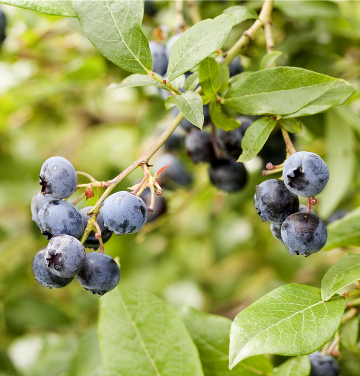 Die Amerikanische Heidelbeere (Vaccinium corymbosum) bildet blaue Beeren. Diese sind süß-säuerlich im Geschmack. Für eine ertragreiche Ernte ab Juli schaffen humoser, sandiger, schwachsaurer Boden und ein sonniger bis halbschattiger Standort optimale Bedingungen. Ihre hellrosafarbenen Blüten sind eine schöne Erscheinung. Die Amerikanische Heidelbeere wird mit ihrem buschigen und breiten Wuchs etwa 2 m hoch und 2 m breit, dadurch kann sie hervorragend in Töpfen auf Balkon oder Terrasse angebaut werden.
