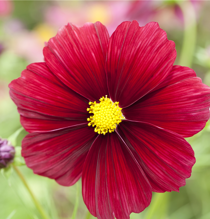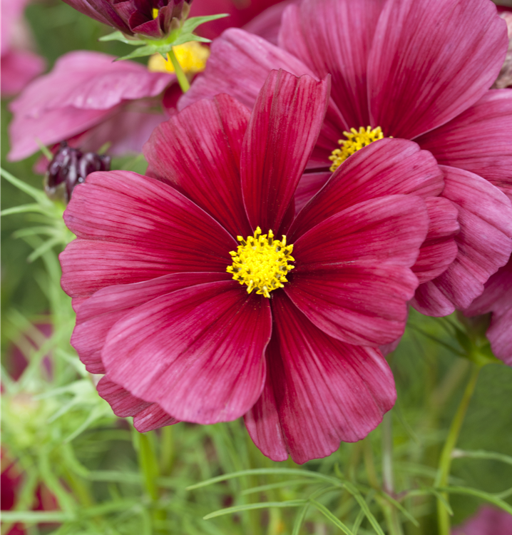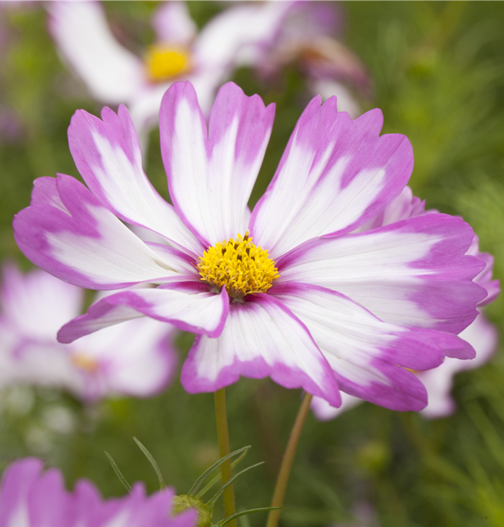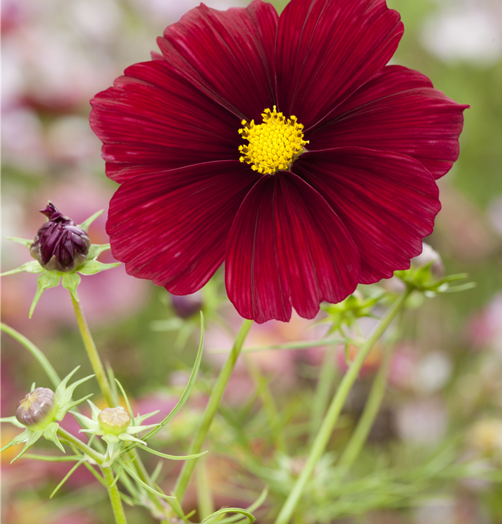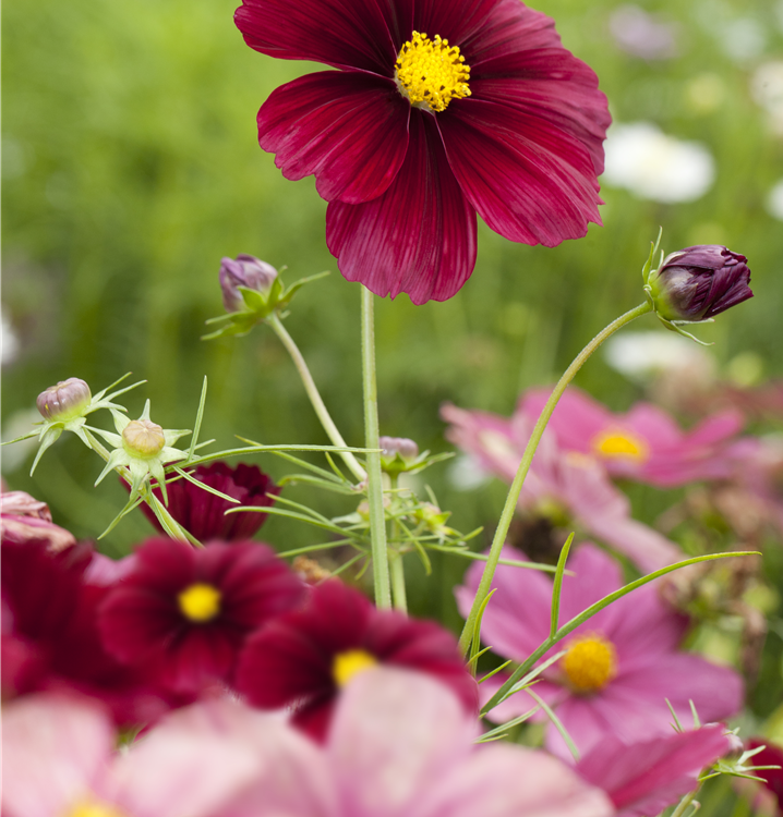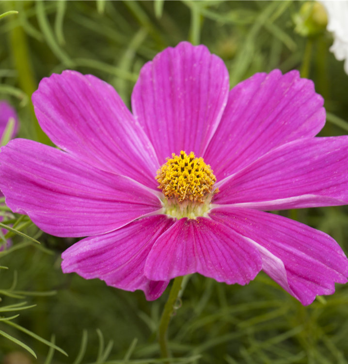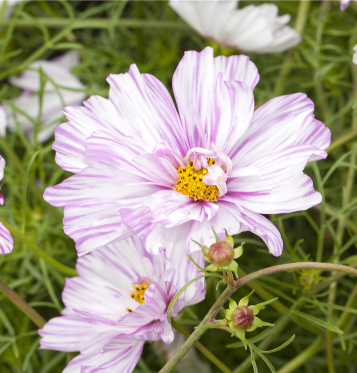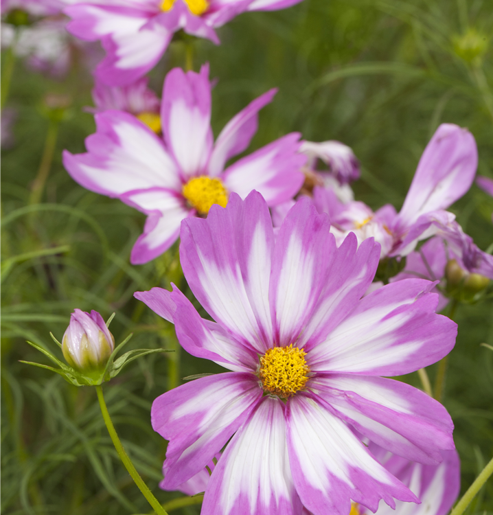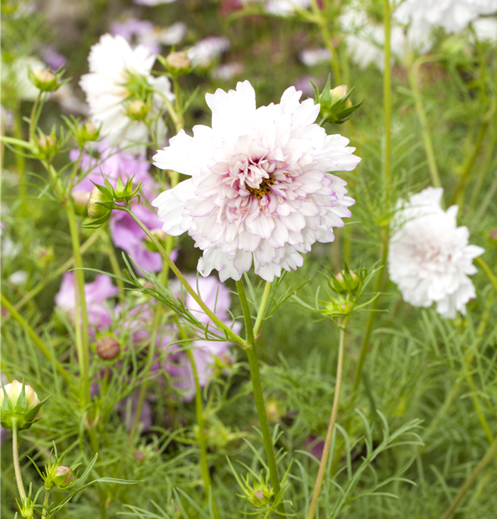 Das Fiederblättrige Schmuckkörbchen (Cosmos bipinnatus) ist eine beliebte Pflanze für den Balkon, die während der gesamten Saison unzählige weiße, rosafarbene oder rote Blüten bildet. Die hellgrünen Blätter sind gefiedert. Ein sonniger Standort und ein durchlässiges Substrat werden bevorzugt.