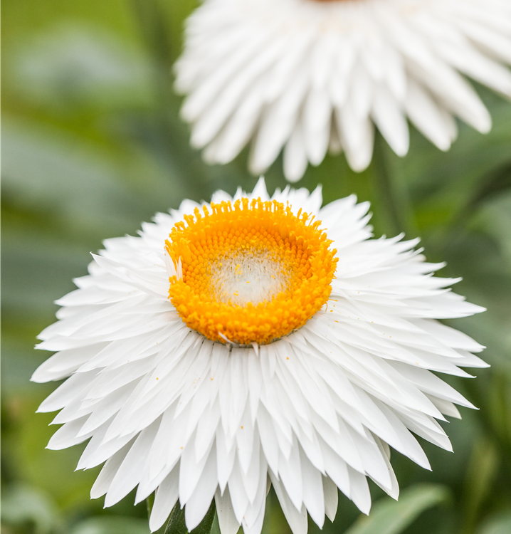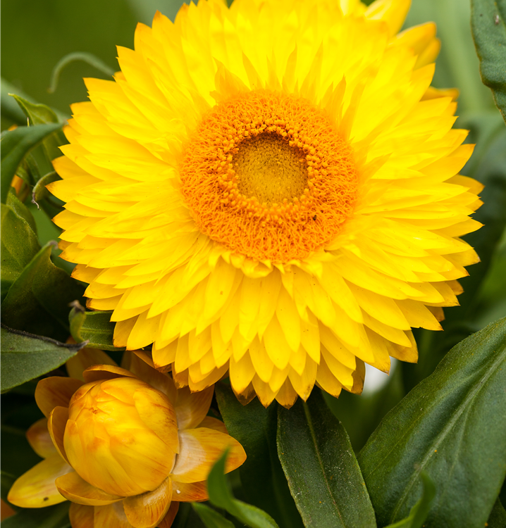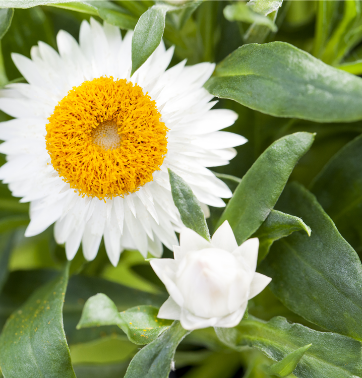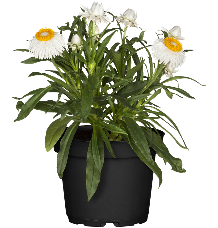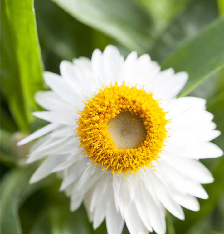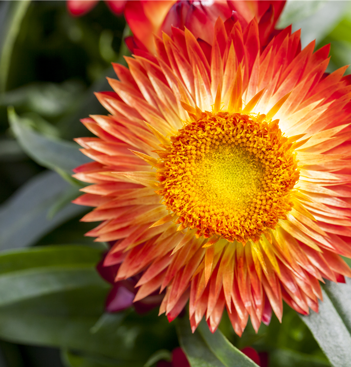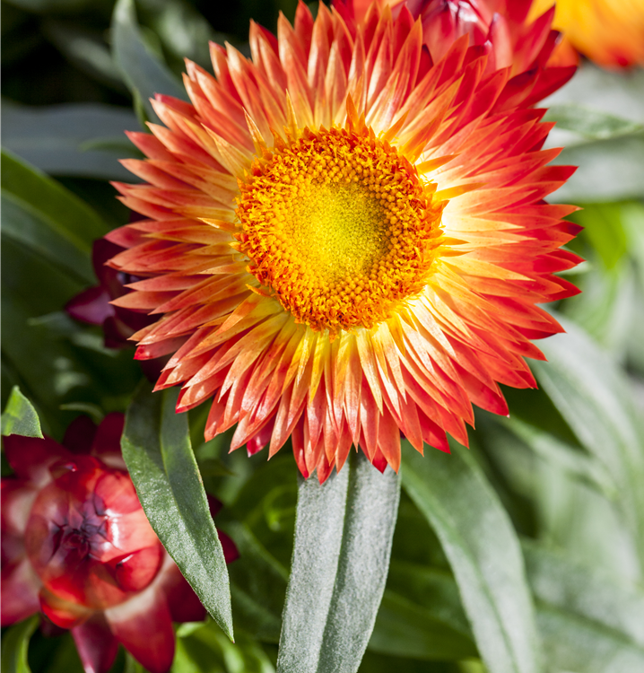 Die Garten-Strohblume (Helichrysum bracteatum) ist eine beliebte Pflanze für den Balkon, die während der gesamten Saison unzählige weiße, gelbe, orangefarbene, rote oder rosafarbene Blüten bildet. Ein sonniger Standort und ein durchlässiges Substrat werden bevorzugt.