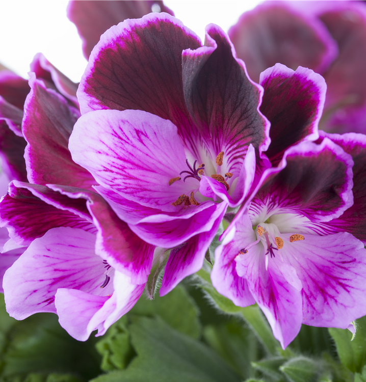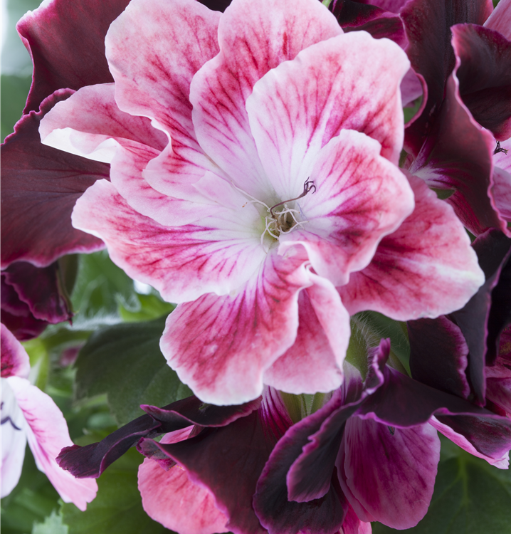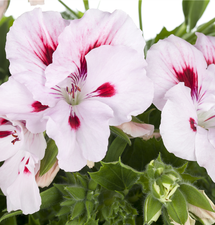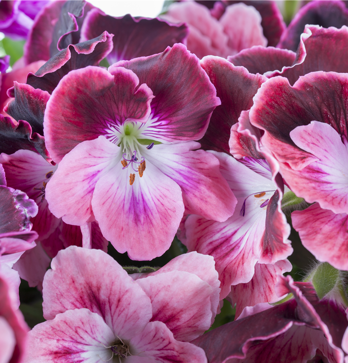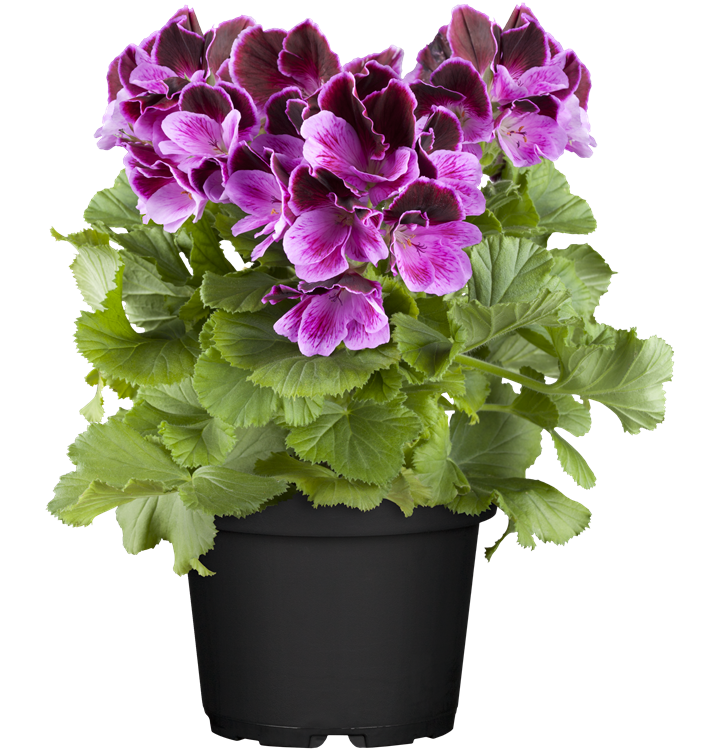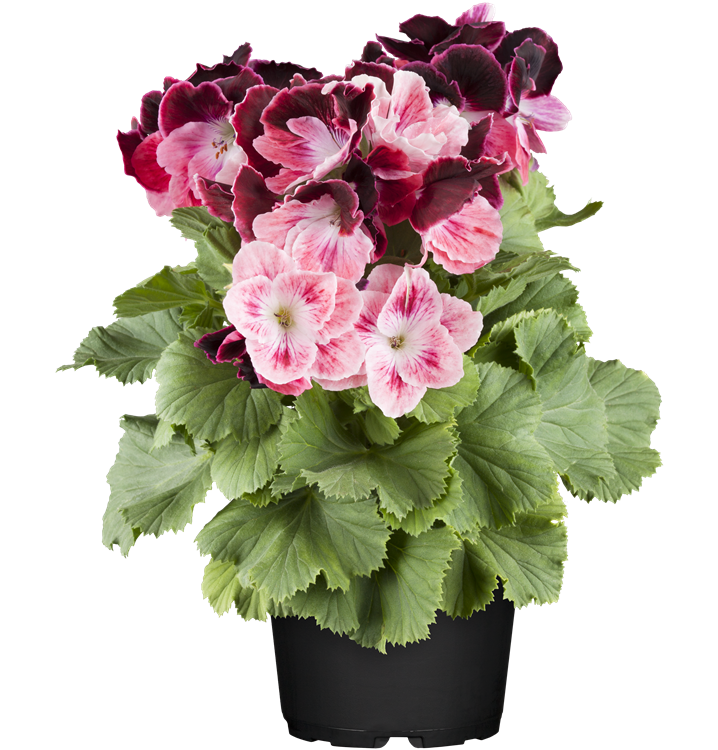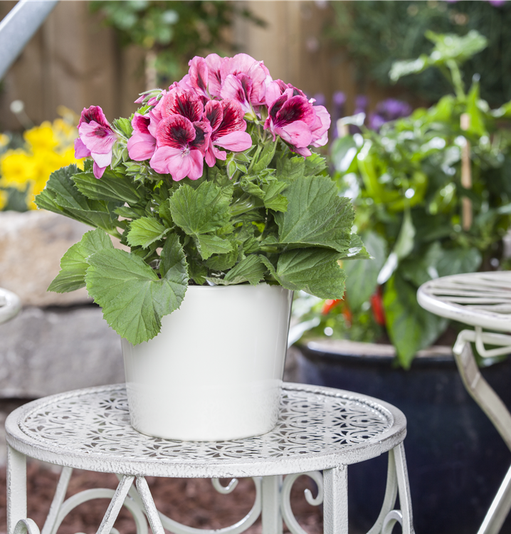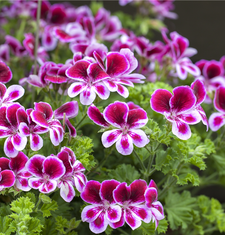 Die Englische Geranie (Pelargonium grandiflorum) ist eine beliebte Pflanze für den Balkon, die während der gesamten Saison unzählige weiße, rote oder rosafarbene Blüten bildet. Die mittelgrünen Blätter sind handförmig. Ein sonniger bis halbschattiger Standort und ein durchlässiges Substrat werden bevorzugt. Mit ihrem buschigen und aufrechten Wuchs passt die Englische Geranie besonders gut in Blumenampeln und hängende Pflanzkörbe.