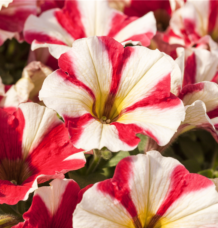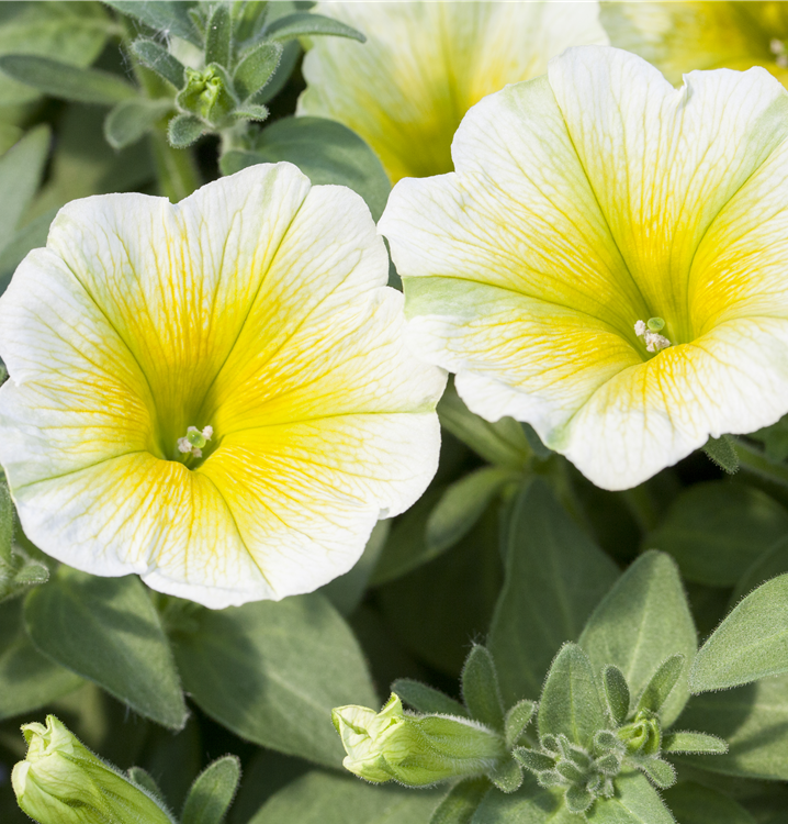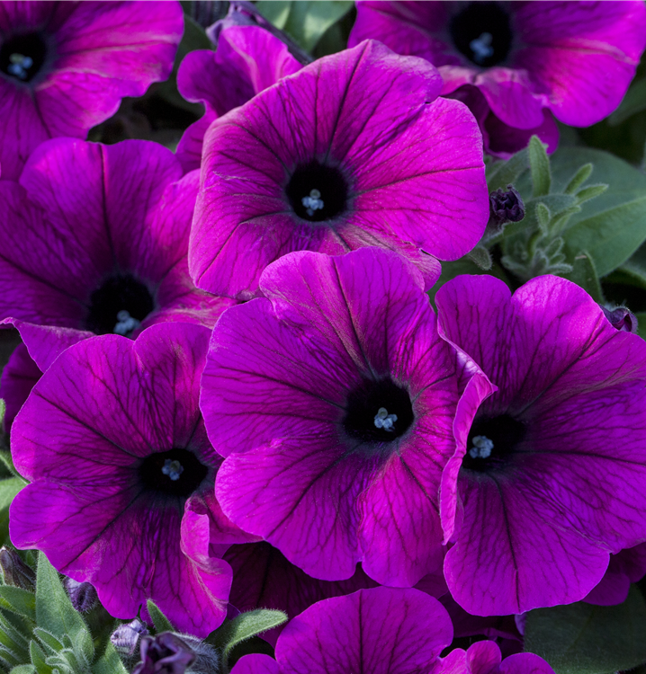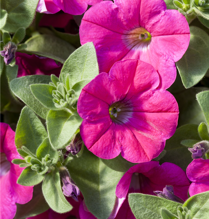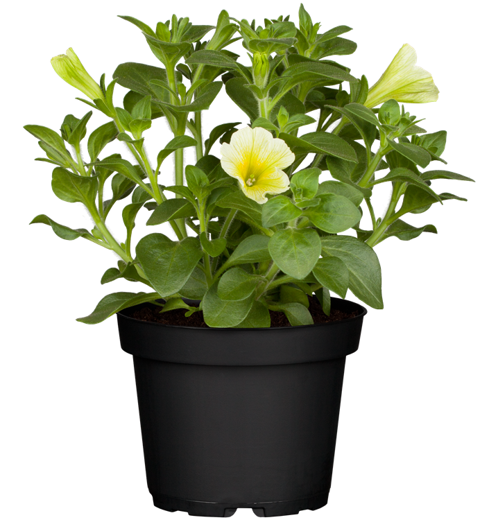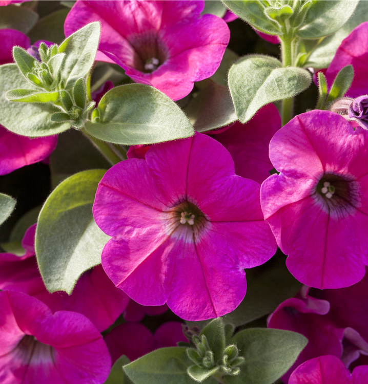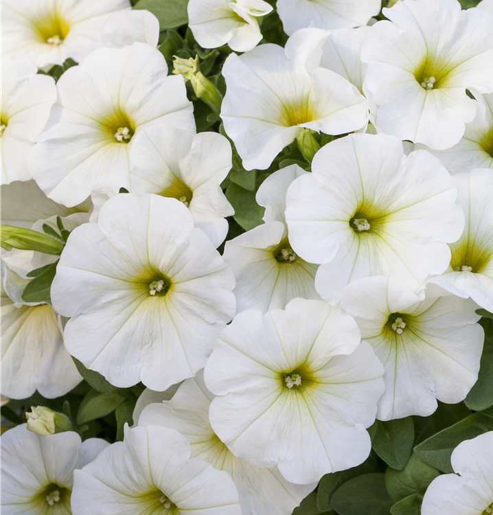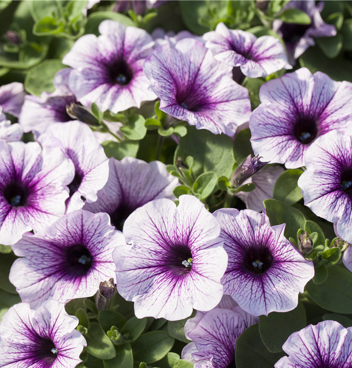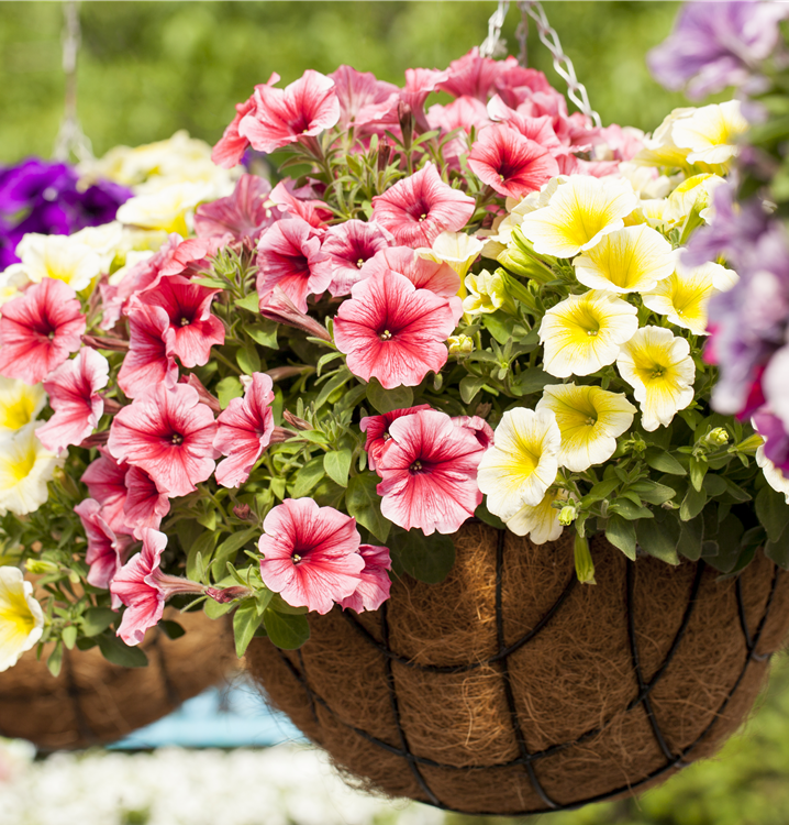 Die Petunie 'Potunia'® (Petunia) ist eine beliebte Pflanze für den Balkon, die während der gesamten Saison unzählige bunte, weiße, rosafarbene, rote oder violette Blüten bildet. Die mittelgrünen Blätter sind eiförmig, lanzettlich. Ein sonniger Standort und ein durchlässiges Substrat werden bevorzugt. Mit ihrem überhängenden Wuchs passt die Petunie 'Potunia'® besonders gut in Blumenampeln und hängende Pflanzkörbe.