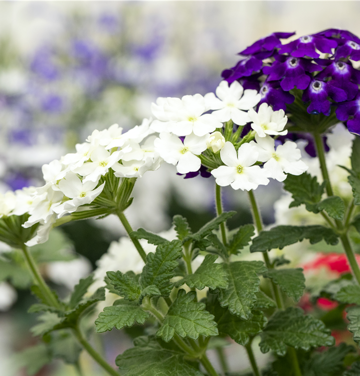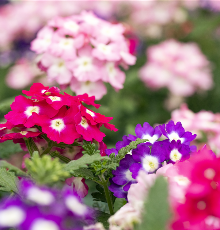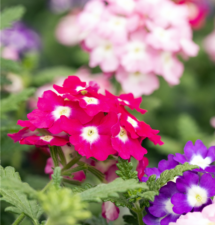 Die Verbene 'Trixi'® (Verbena) ist eine beliebte Pflanze für den Balkon, die während der gesamten Saison unzählige bunte Blüten bildet. Ein sonniger Standort und ein durchlässiges Substrat werden bevorzugt.