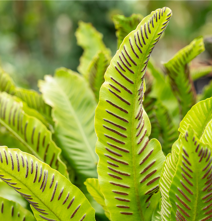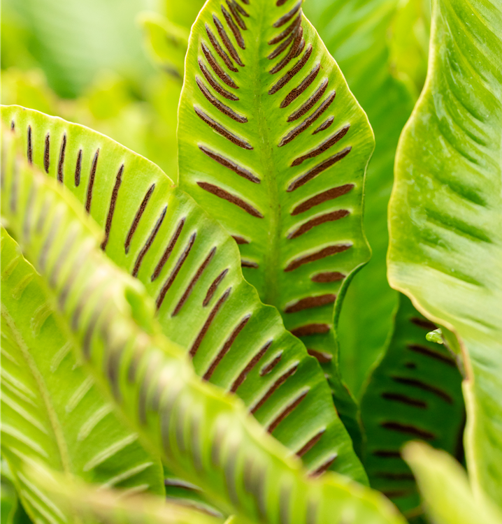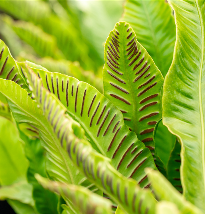 Hoher Blattschmuckwert. Die immergrünen Blätter des Hirschzungenfarns sind hellgrün, lineal, glänzend, gewellt.