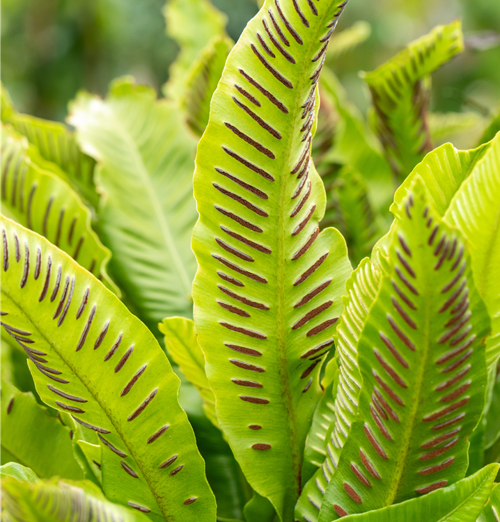 Der Hirschzungenfarn (Asplenium scolopendrium) ist mit seinen glänzenden, linealen, hellgrünen Blattwedeln ein dekoratives Gestaltungselement im Garten. An einem halbschattigen bis schattigen Standort mit einem möglichst durchlässigen, humosen, kalkhaltigen Boden fühlt er sich am wohlsten. Bei günstigen Bedingungen erreicht dieser winterharte Farn eine Höhe von ca. 60 cm und wird bis zu 40 cm breit.