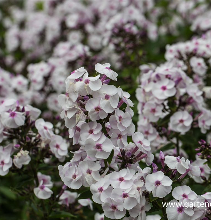 Die Hohe Garten-Flammenblume 'Ice Cream' (Phlox paniculata) ist eine aufrechte Staude, die von Juli bis September weiß-rosafarbene, in Dolden angeordnete Blüten mit einem leichten Duft bildet. An einem sonnigen bis halbschattigen Standort mit durchlässigem, nährstoffreichem Boden erreicht sie gewöhnlich eine Höhe von ca. 80 cm und wird ca. 40 cm breit. Die Hohe Garten-Flammenblume 'Ice Cream' ist gut frostverträglich.