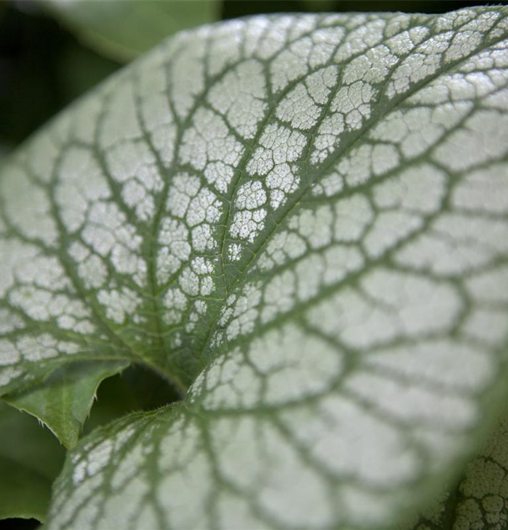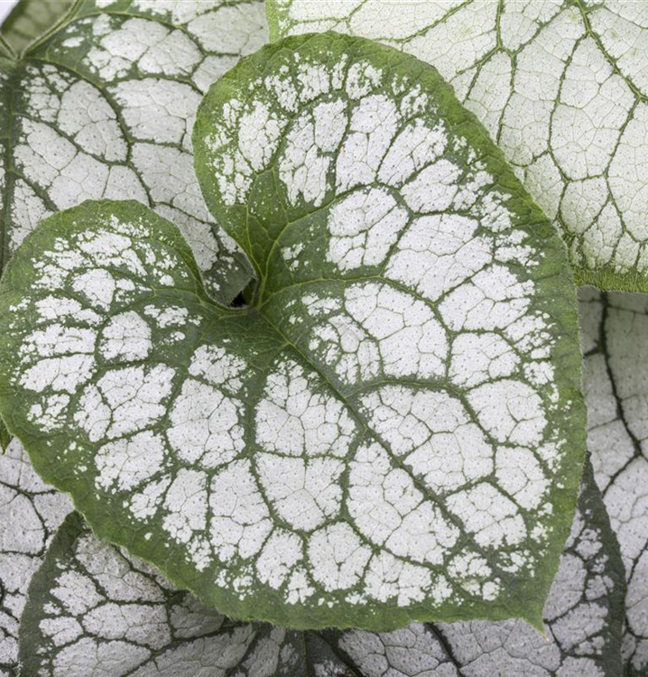 Hoher Blattschmuckwert. Die sommergrünen Blätter des Kaukasusvergissmeinnichts 'Jack Frost'(s) sind silberweiß, grün geädert, herzförmig und weisen einen grünen Rand auf.