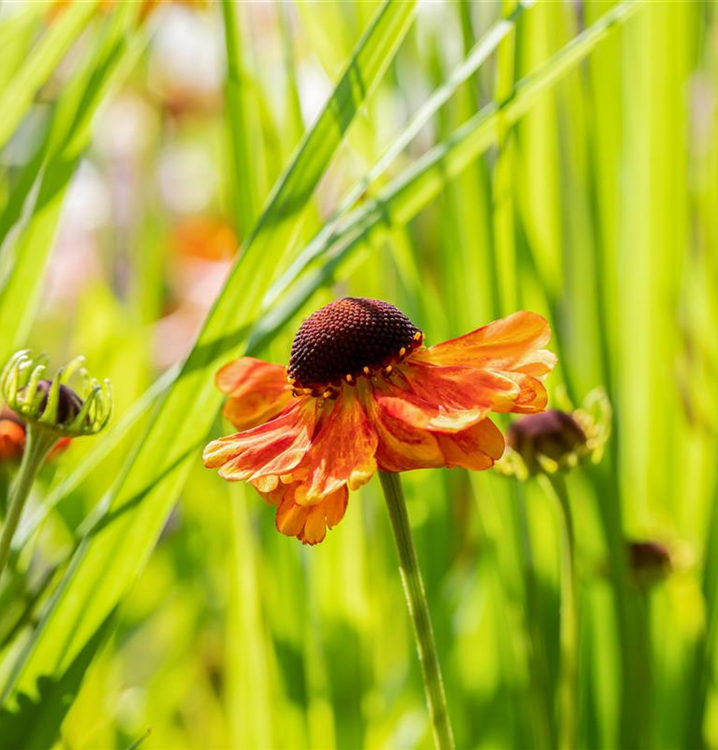 Helenium 'Zimbelstern' bildet körbchenartige, gelb-braune Blüten ab Juli. Diese verströmen einen leichten Duft.