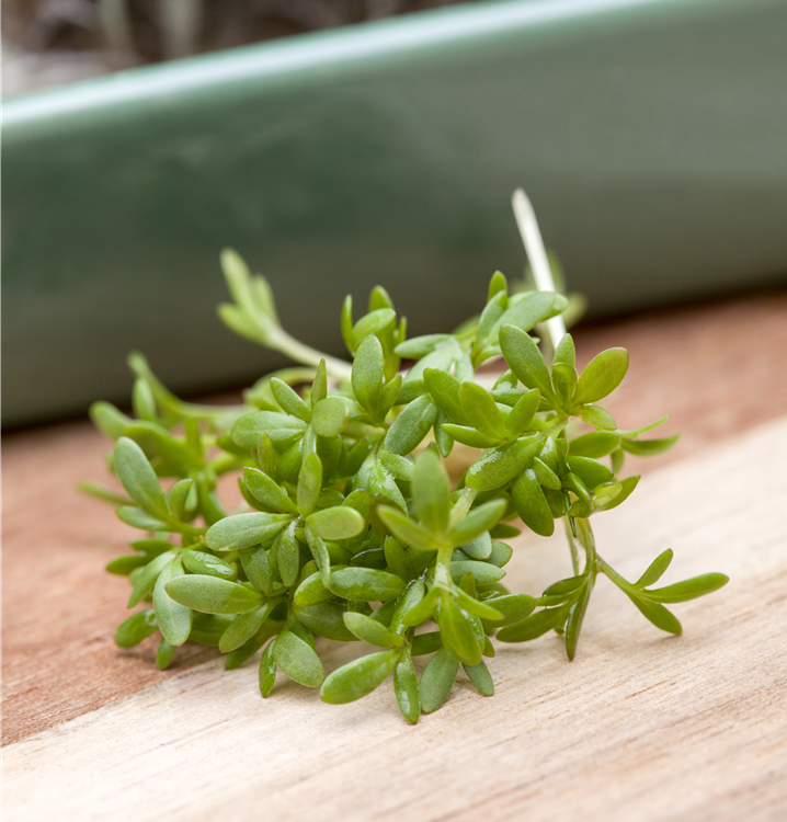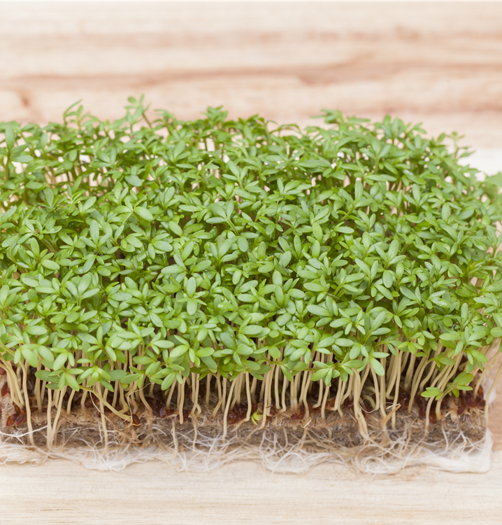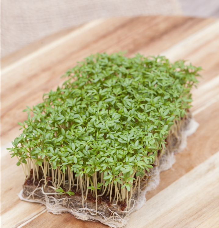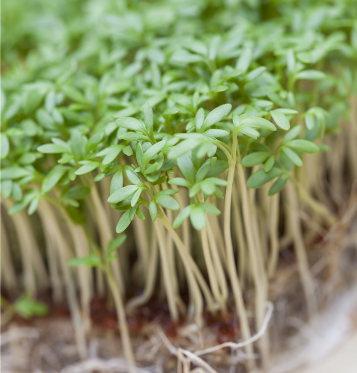 Die Gartenkresse (Lepidium sativum) ist eine Kräuterpflanze mit einem nussigen, scharfen Geschmack. Ihre mittelgrünen Blätter sind lanzettlich und gebuchtet. Für das optimale Wachstum der Gartenkresse werden ein sonniger Standort und durchlässiger, nährstoffreicher Boden benötigt.