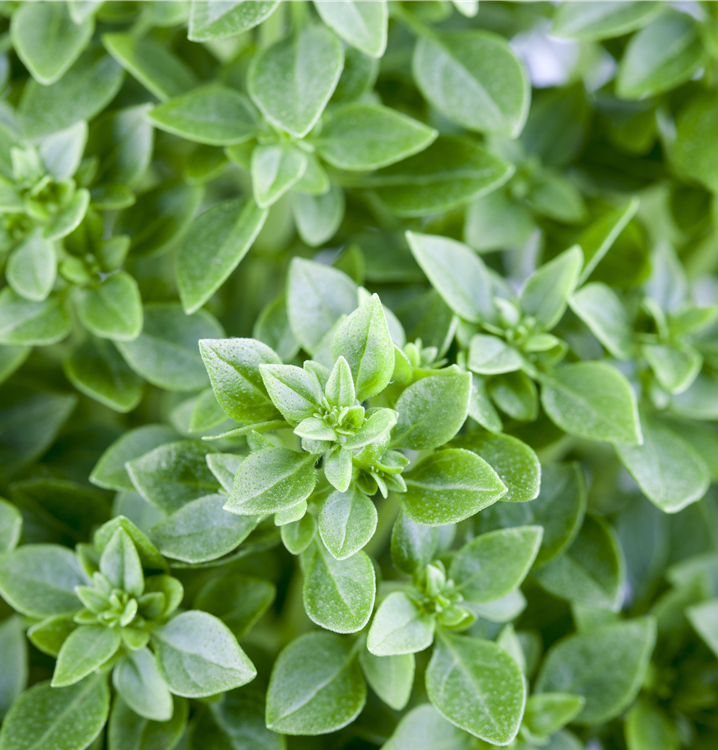 Zum Verzehr geeignet. Die mittelgrünen, gewellten Blätter sind eiförmig und überzeugen mit würzigem Geschmack.