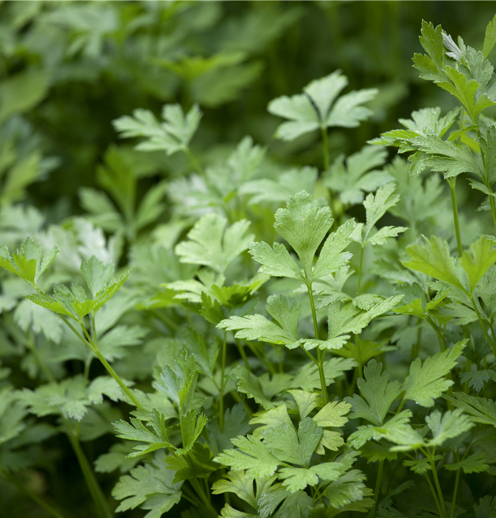 Zum Verzehr geeignet. Die dunkelgrünen, gewellten Blätter sind gefiedert und überzeugen mit aromatischem Geschmack.