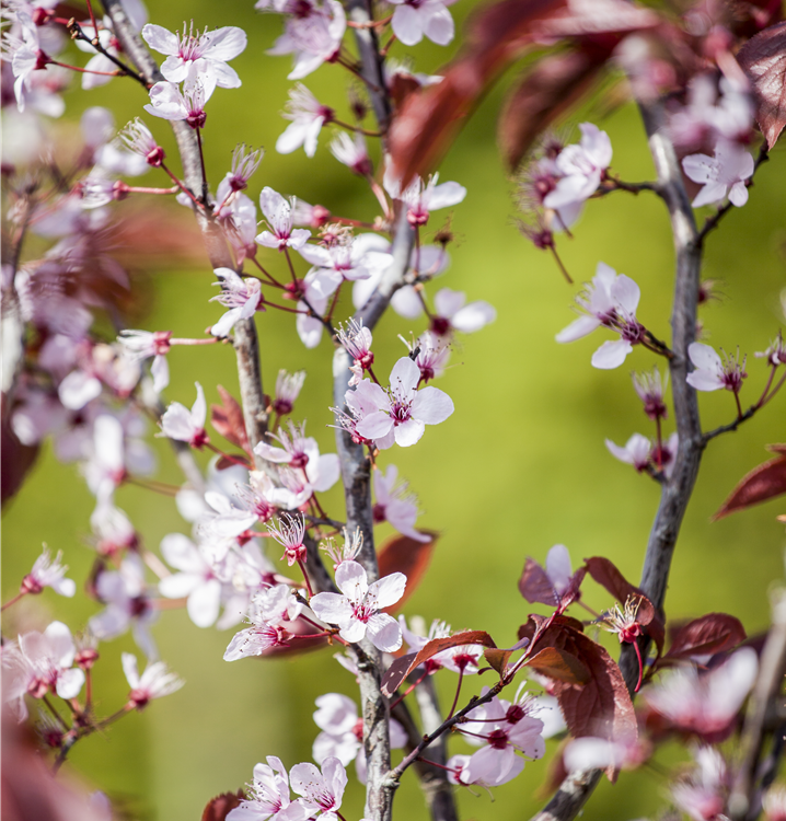 Die Blutpflaume 'Nigra' (Prunus cerasifera) ist ein rundlicher, malerischer Kleinbaum mit dekorativen, dunkelroten, runden Früchten. Diesen voraus bringt sie von März bis April rosafarbene, schalenförmige Blüten hervor. Zudem trägt die Blutpflaume 'Nigra', glänzende, eiförmige, schwarz-rote Blätter. An einem sonnigen bis halbschattigen Standort mit kalkhaltigem, nährstoffreichem, lehmigem Boden erreicht sie gewöhnlich eine Höhe von ca. 7 m und wird ca. 6 m breit.