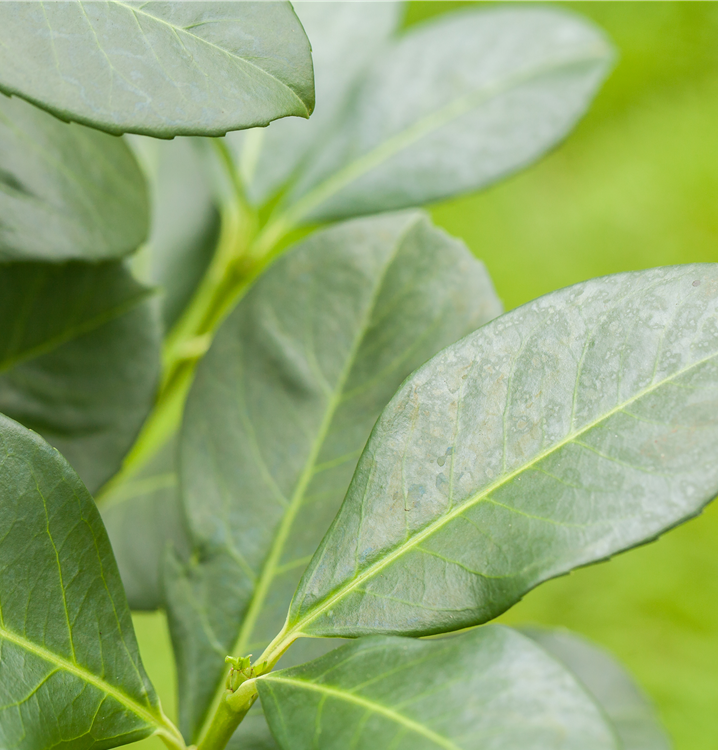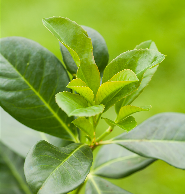 Die immergrünen Blätter der Lorbeerkirsche sind dunkelgrün, eiförmig, glänzend, wechselständig.