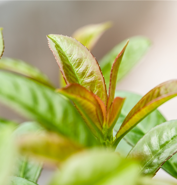 Die immergrünen Blätter der Lorbeerkirsche 'Etna'® sind dunkelgrün, eiförmig, glänzend, wechselständig. Kupferbrauner Austrieb.