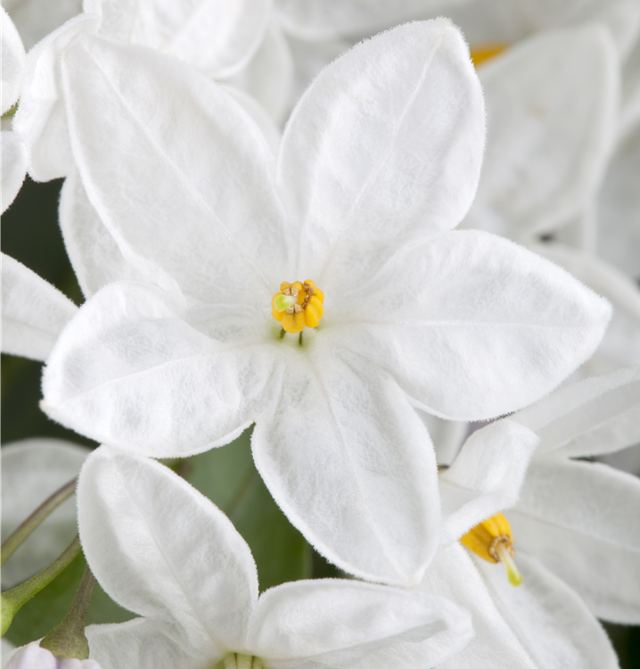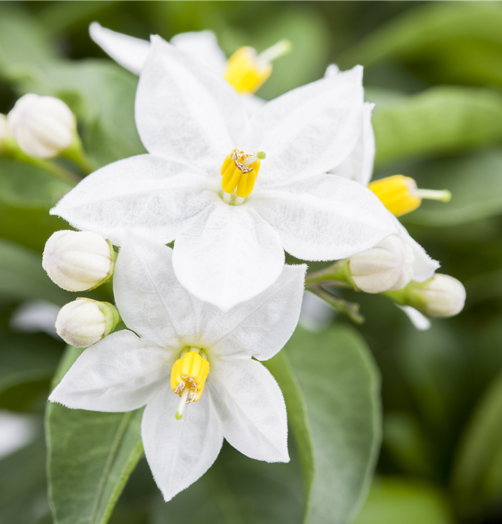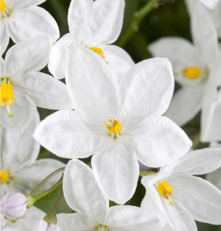 Solanum jasminoides bildet sternförmige, weiße Blüten ab Juni.