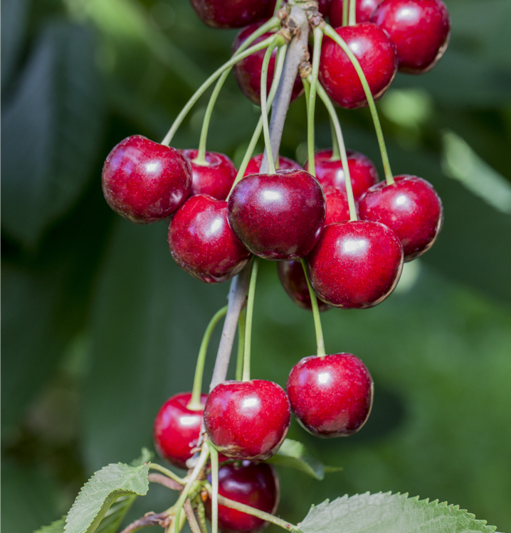 Die roten Früchte haben einen süß-säuerlichen Geschmack. Reifezeit ab Juli.