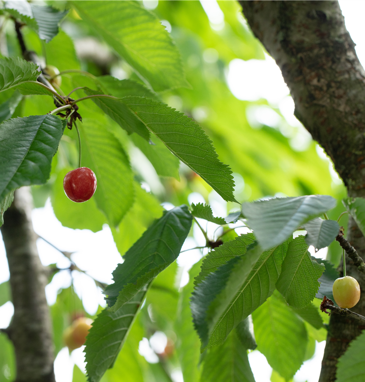 Die Sauerkirsche (Prunus cerasus) bildet rote Früchte. Sie haben einen süß-säuerlichen Geschmack. Für eine ertragreiche Ernte ab Juli schaffen durchlässiger, nährstoffreicher Boden und ein sonniger bis halbschattiger Standort optimale Bedingungen. Ihre weißen Blüten sind eine schöne Erscheinung. Die Sauerkirsche wird mit ihrem aufrechten Wuchs etwa 12 m hoch und 6 m breit.