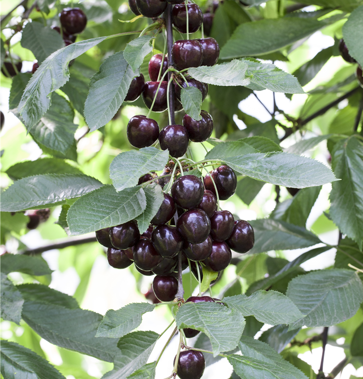 Die Sauerkirsche 'Schattenmorelle' (Prunus cerasus) bildet schwarz-rote, mittelgroße, saftige Früchte. Sie haben einen säuerlichen Geschmack. Für eine ertragreiche Ernte ab Ende Juli schaffen durchlässiger, nährstoffreicher Boden und ein sonniger bis halbschattiger Standort optimale Bedingungen. Ihre weißen Blüten sind eine schöne Erscheinung. Die Sauerkirsche 'Schattenmorelle' wird mit ihrem aufrechten Wuchs etwa 4 m hoch und 3,5 m breit.