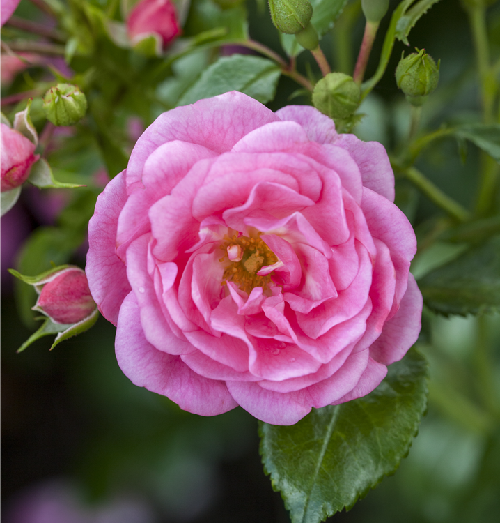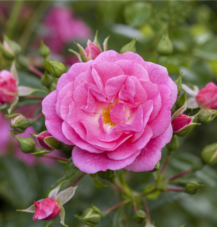 Die roten, gelben, weißen, rosafarbenen, schalenförmigen Blüten der Beetrose erscheinen in Dolden von Juni bis September.
