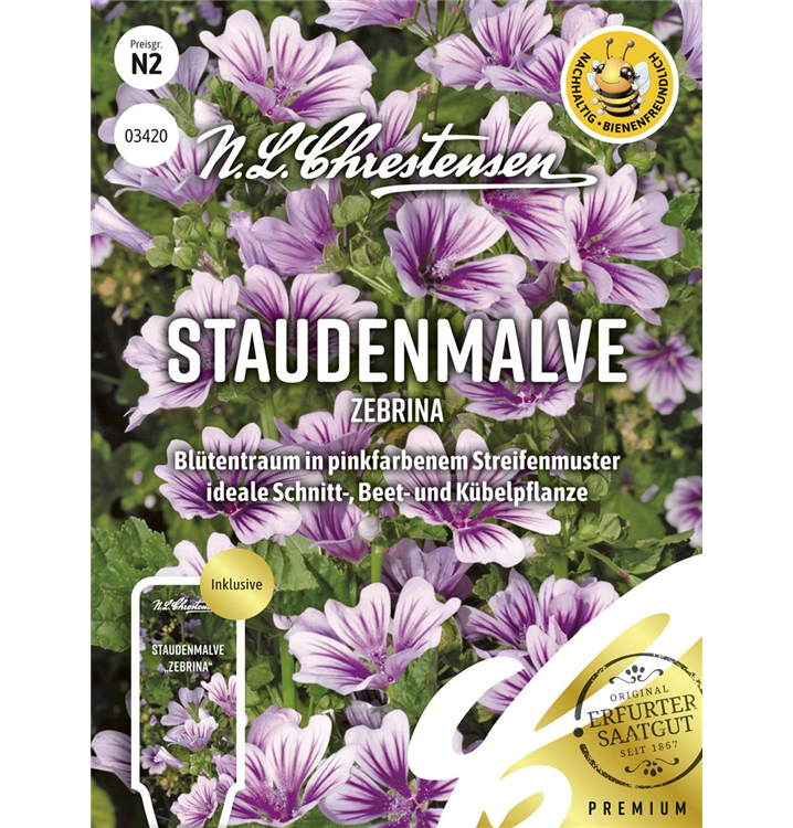 Die Garten-Malve 'Zebrina' (Malva sylvestris) ist eine aufrechte Staude, die von Juni bis September violette Blüten bildet. An einem sonnigen Standort mit humosem, nährstoffreichem Boden erreicht sie gewöhnlich eine Höhe von ca. 1 m und wird ca. 60 cm breit. Die Garten-Malve 'Zebrina' ist gut frostverträglich.