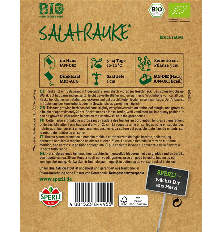 Der Rucola (Eruca sativa) ist eine würzig, nussig schmeckende Gemüsepflanze. Seine Blätter können geerntet werden, sobald er ca. 20 erreicht hat. Für das optimale Wachstum des Rucolas werden ein sonniger Standort und durchlässiger, nährstoffreicher Boden benötigt.