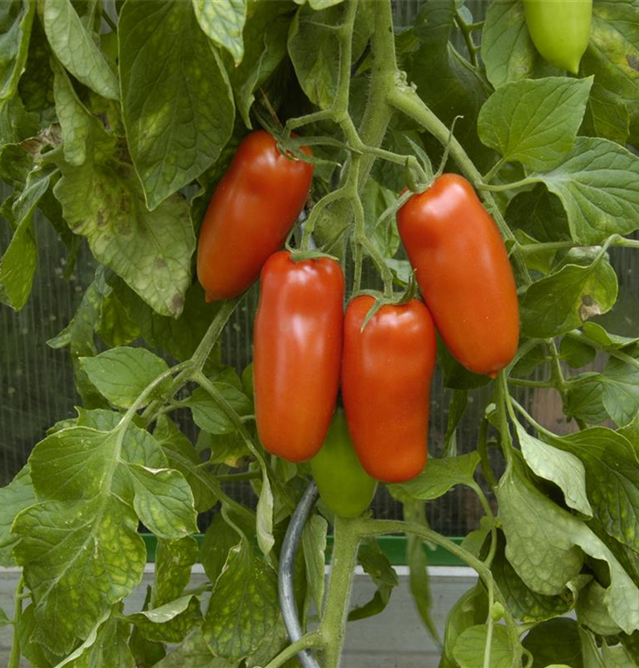 Die Tomate 'San Marzano' (Solanum lycopersicum) bildet mittelgroße Früchte, die aromatisch, fruchtig schmecken und bereits ab Juli geerntet werden können. Für das optimale Wachstum der Tomate 'San Marzano' werden ein sonniger Standort und durchlässiger, nährstoffreicher Boden benötigt.