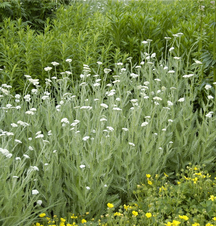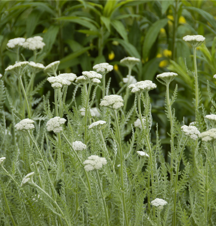 Die Schafgarbe (Achillea millefolium) ist eine aufrechte Staude, die von Juni bis Juli weiße, in Dolden angeordnete Blüten mit einem angenehmen Duft bildet. Wiederholte Blüte kommt bei richtiger Pflege im September vor. Ihre matten, gefiederten Blätter sind mittelgrün. An einem sonnigen bis halbschattigen Standort mit lockerem, nährstoffreichem Boden erreicht sie gewöhnlich eine Höhe von ca. 60 cm und wird ca. 40 cm breit. Die Schafgarbe ist gut frostverträglich.
