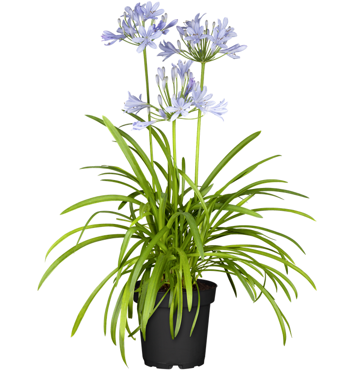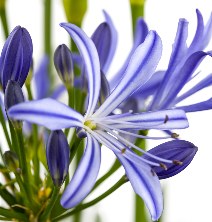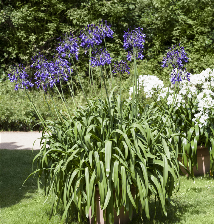 Agapanthus africanus bildet sternförmige, in Ähren angeordnete, blaue, weiße Blüten ab Juni.
