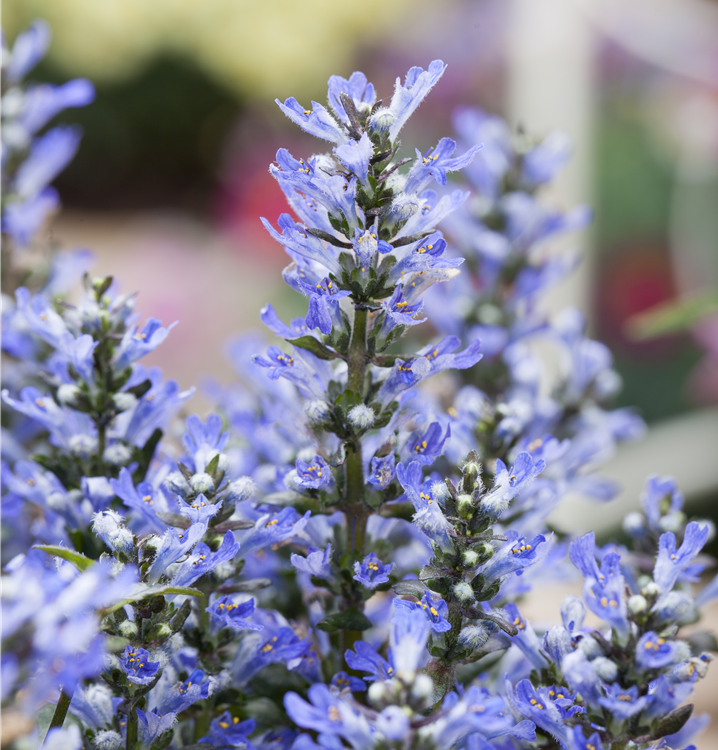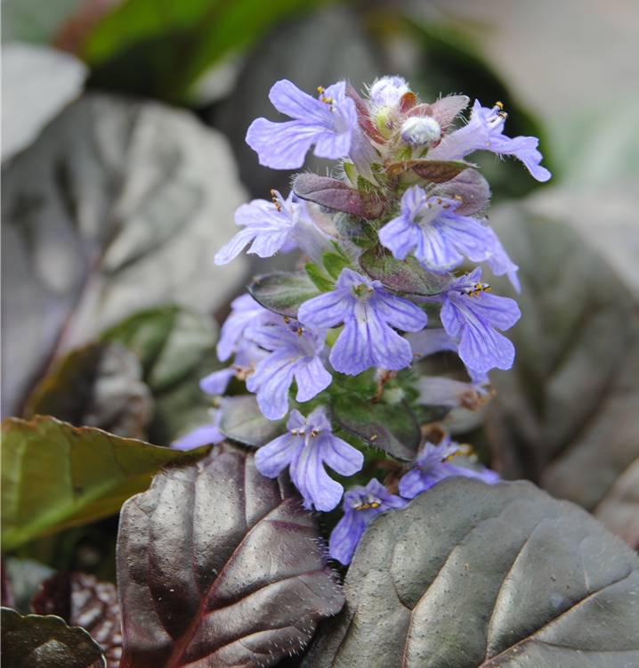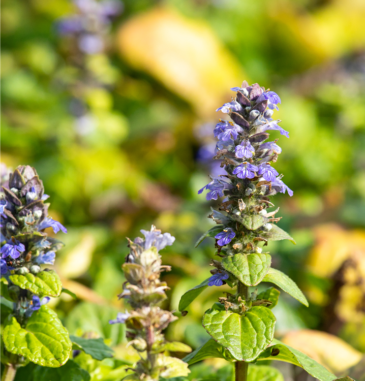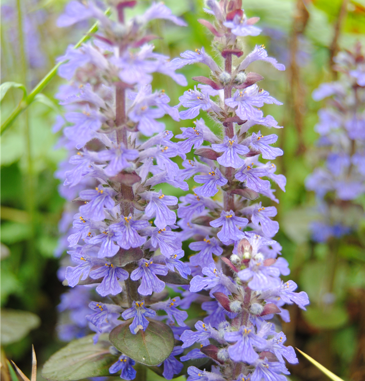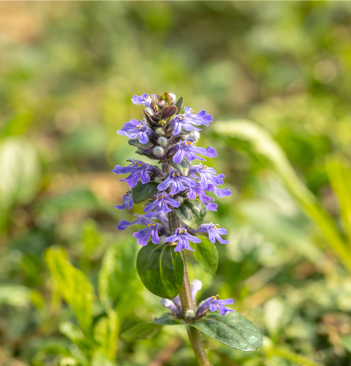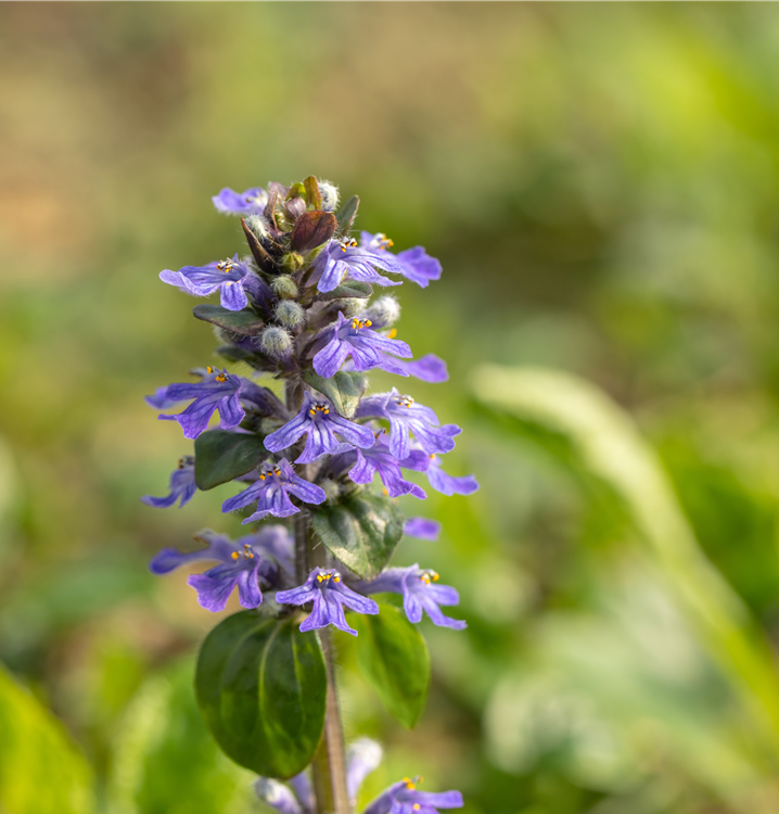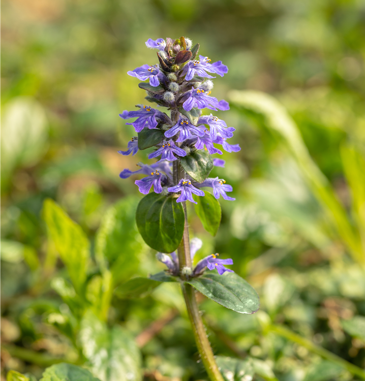 Ajuga reptans bildet lippenförmige, in Quirle angeordnete, blaue Blüten ab April.