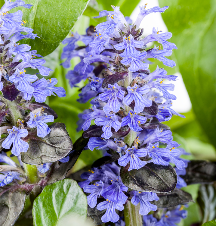 Ajuga reptans 'Atropurpurea' bildet lippenförmige, in Quirle angeordnete, blaue Blüten ab April.