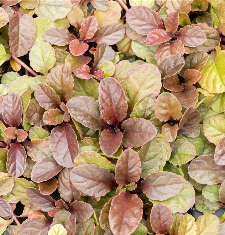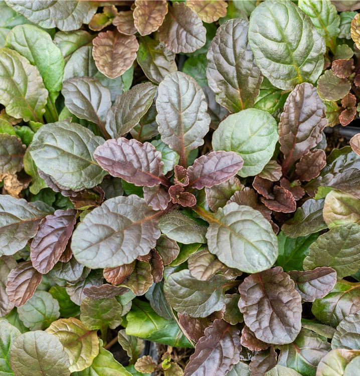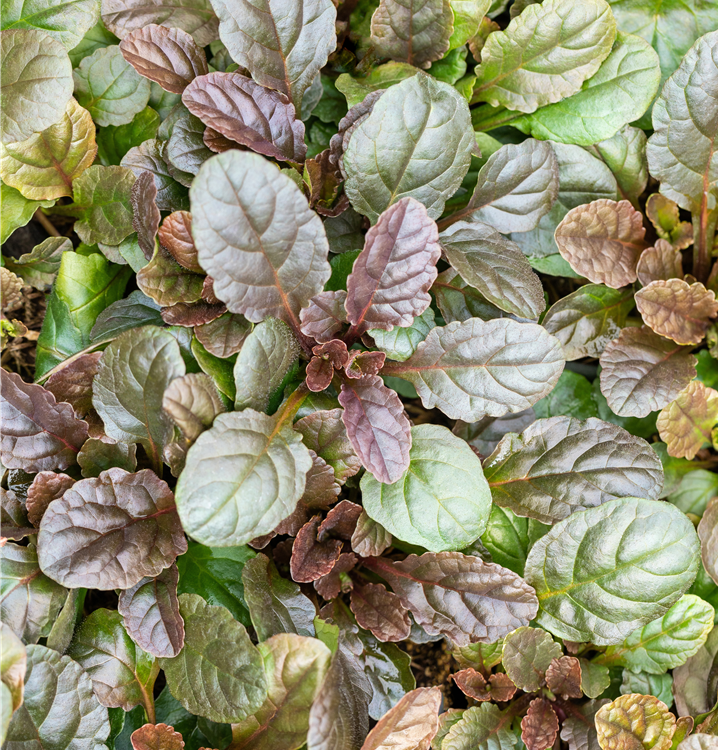 Hoher Blattschmuckwert. Die wintergrünen Blätter des Rotblättrigen Garten-Günsels 'Atropurpurea' sind bronze, eiförmig, glänzend, ganzrandig.