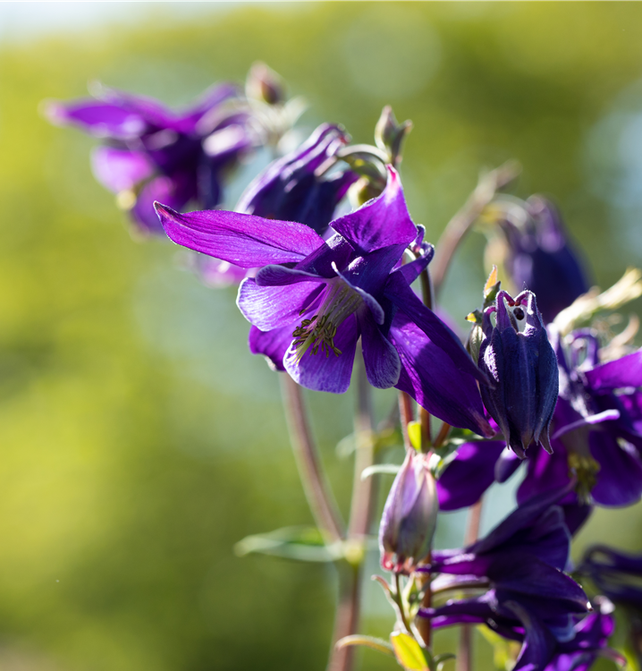 Aquilegia vulgaris bildet glockenförmige, dunkelblaue, violette, rosafarbene, weiße Blüten ab Mai.
