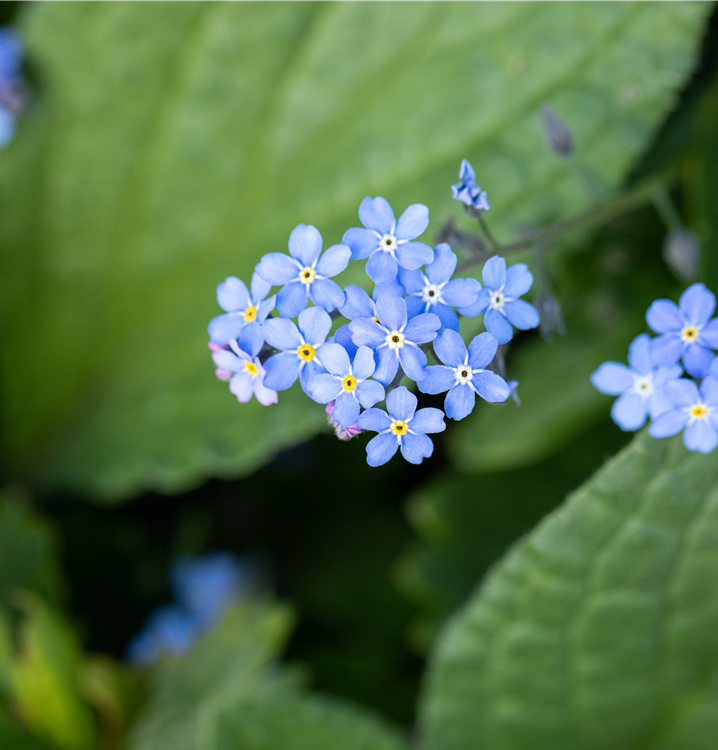 Das Kaukasus-Vergissmeinnicht (Brunnera macrophylla) ist eine ausladende, breite Staude mit dekorativen, herzförmigen, dunkelgrünen Blättern. Von April bis Mai trägt es blaue, radförmige, in Rispen angeordnete Blüten. An einem sonnigen bis halbschattigen Standort mit durchlässigem, humosem, nährstoffreichem, lehmigem Boden erreicht es gewöhnlich eine Höhe von ca. 40 cm und wird ca. 40 cm breit. Das Kaukasus-Vergissmeinnicht ist gut frostverträglich.