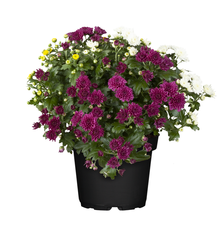 Die Herbst-Chrysantheme 'Trio' (Chrysanthemum indicum) ist eine buschige Staude, die von August bis November mehrfarbige, körbchenartige Blüten bildet. Ihre gefingerten Blätter sind mittelgrün. An einem sonnigen, windgeschützten Standort mit durchlässigem Boden erreicht sie gewöhnlich eine Höhe von ca. 80 cm und wird ca. 80 cm breit. Die Herbst-Chrysantheme 'Trio' ist gut frostverträglich.