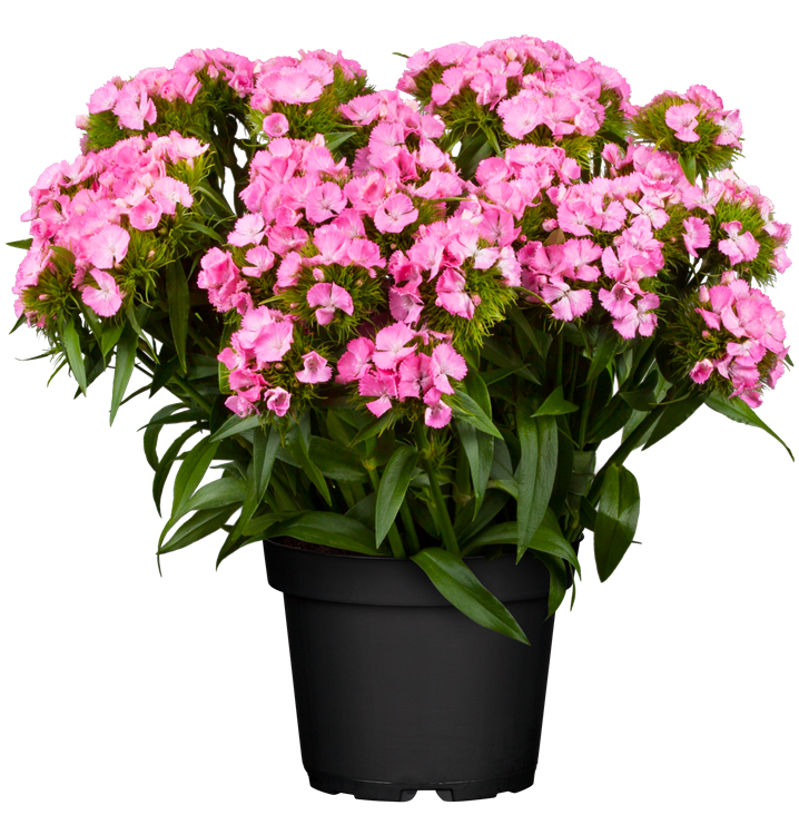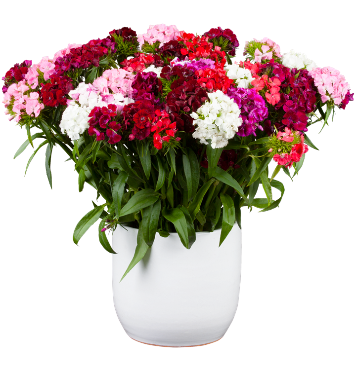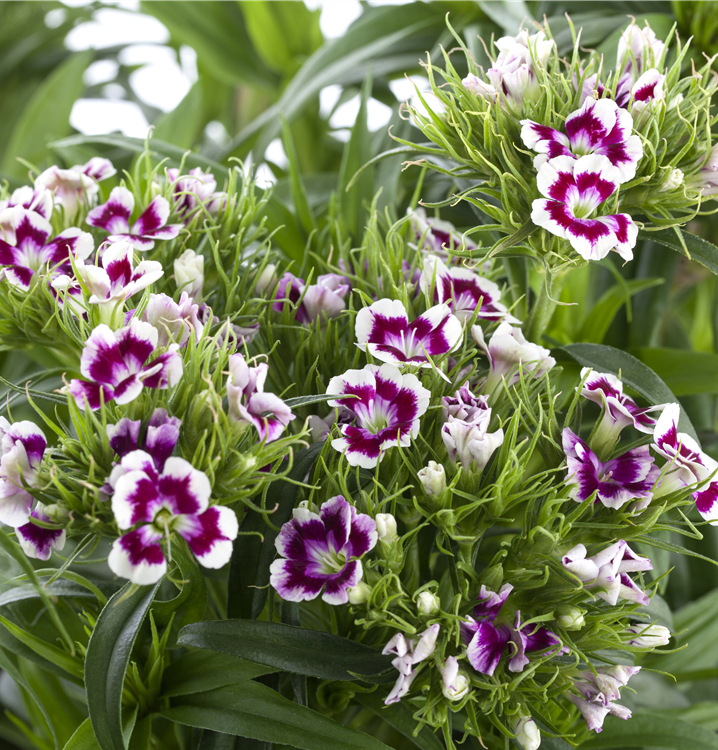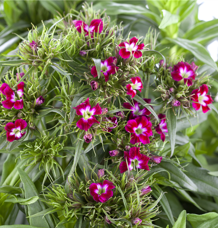 Dianthus barbatus bildet radförmige, weiße, rosafarbene, rote Blüten ab Juni. Diese verströmen einen angenehmen Duft.