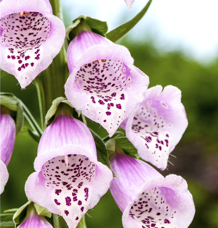 Digitalis purpurea bildet trichterförmige, rote, weiße, rosafarbene Blüten ab Juni.