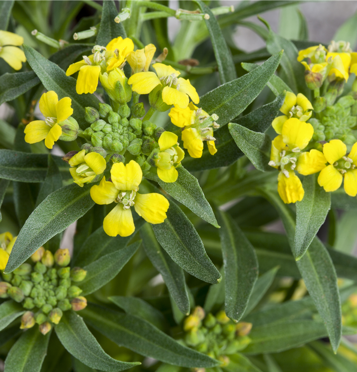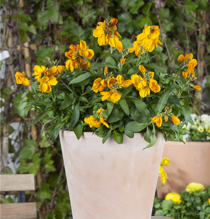 Der Goldlack (Erysimum cheiri) ist eine aufrechte Staude, die von April bis Juni gelbe, orangefarbene oder rote Blüten mit einem starken Duft bildet. Seine lanzettlichen Blätter sind dunkelgrün. An einem sonnigen Standort mit durchlässigem Boden erreicht er gewöhnlich eine Höhe von ca. 60 cm und wird ca. 30 cm breit. Der Goldlack ist an geschützten Standorten gut frostverträglich.