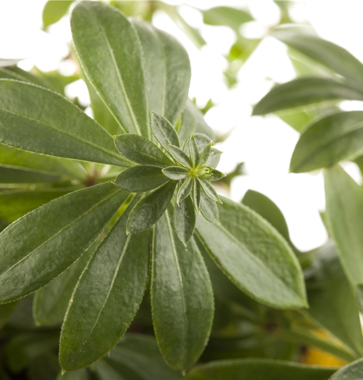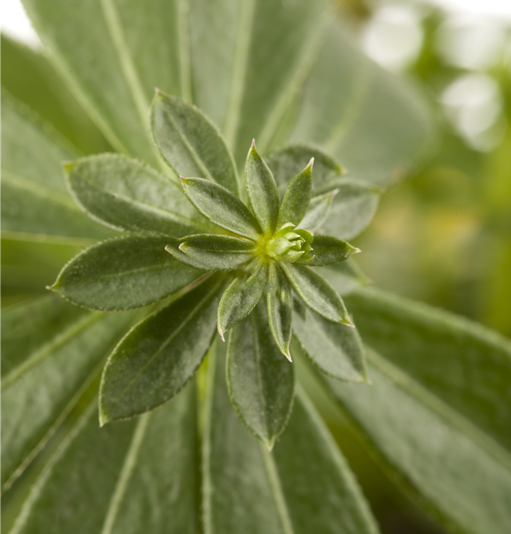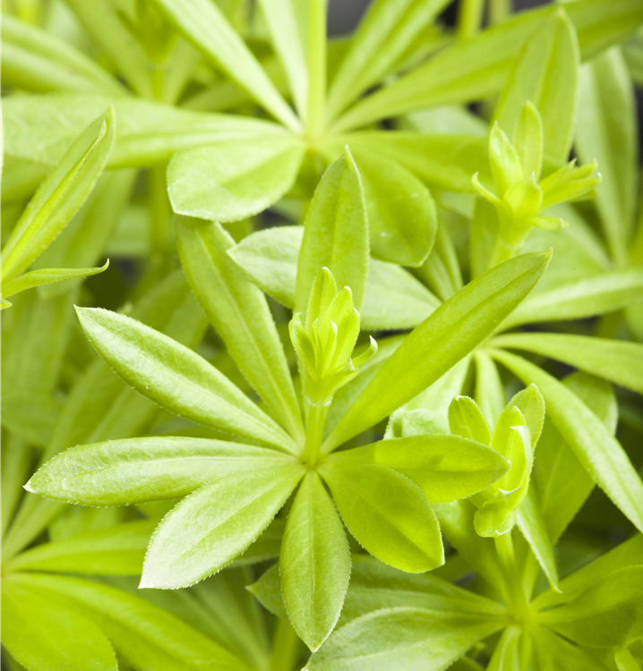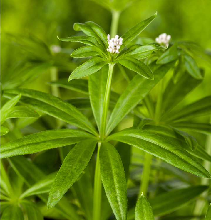 Zum Verzehr geeignet. Die sommergrünen Blätter des Echten Waldmeisters sind dunkelgrün, lanzettlich.