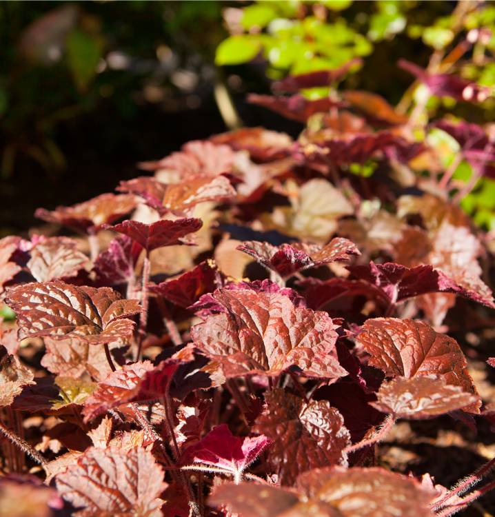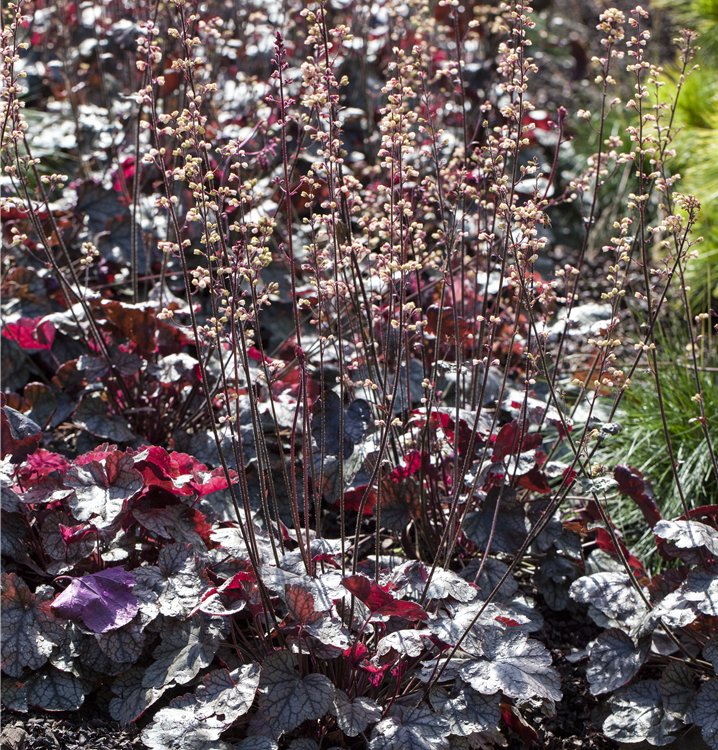 Das Kleinblütige Silberglöckchen (Heuchera micrantha) ist eine buschige, rhizombildende, rosettenartige, wintergrüne Staude mit dekorativen, rundlichen, gekerbten Blättern. Von Juni bis August trägt es hellrosafarbene, glockenförmige, in Trauben angeordnete Blüten. An einem sonnigen bis halbschattigen Standort mit durchlässigem, nährstoffreichem Boden erreicht es gewöhnlich eine Höhe von ca. 50 cm und wird ca. 40 cm breit. Das Kleinblütige Silberglöckchen ist gut frostverträglich.