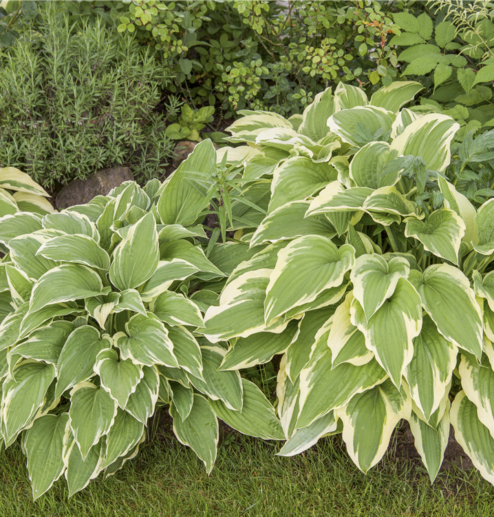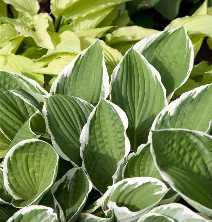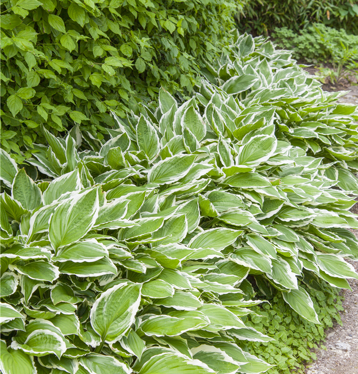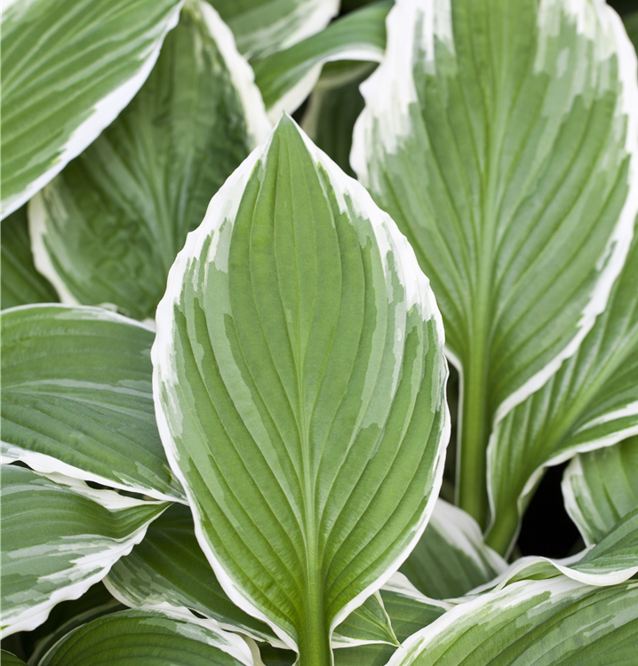 Hoher Blattschmuckwert. Die sommergrünen Blätter der Kleine Siebolds Funkie sind mittelgrün, lanzettlich, grundständig, ganzrandig und weisen einen weißen Rand auf.