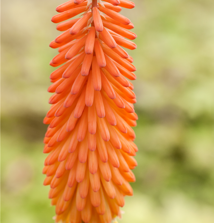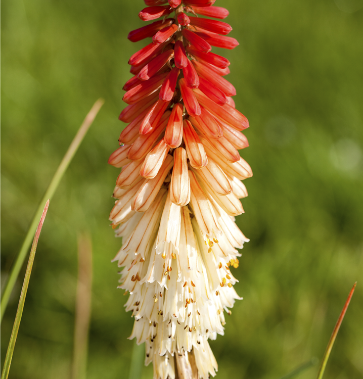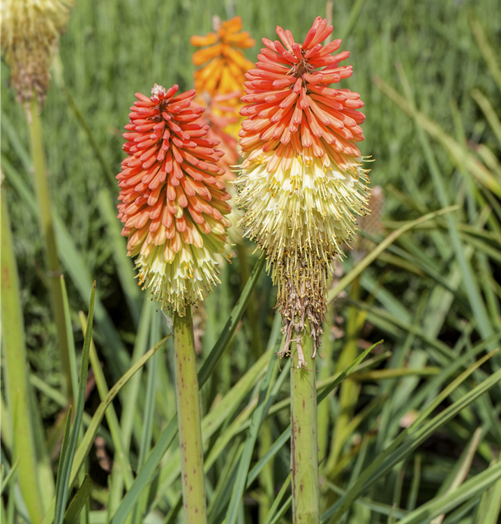 Kniphofia uvaria bildet in Kolben angeordnete, orange-rote Blüten ab Juli.