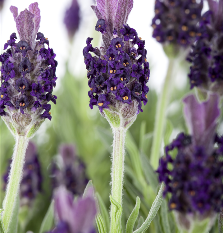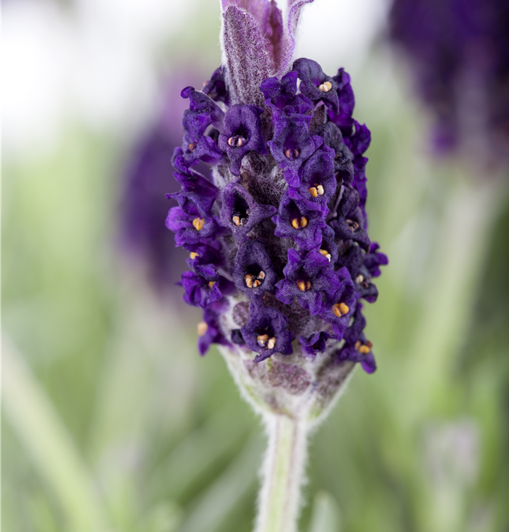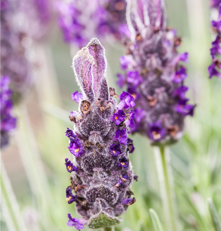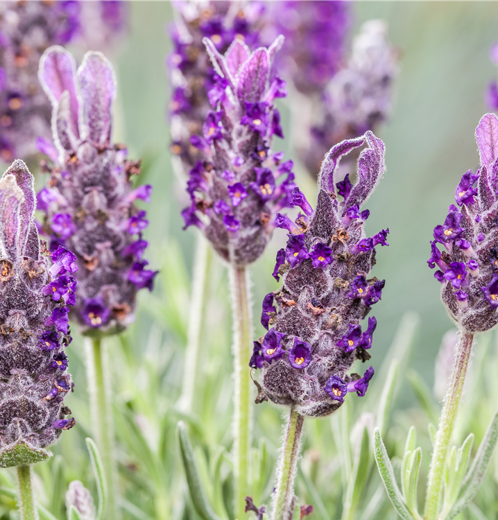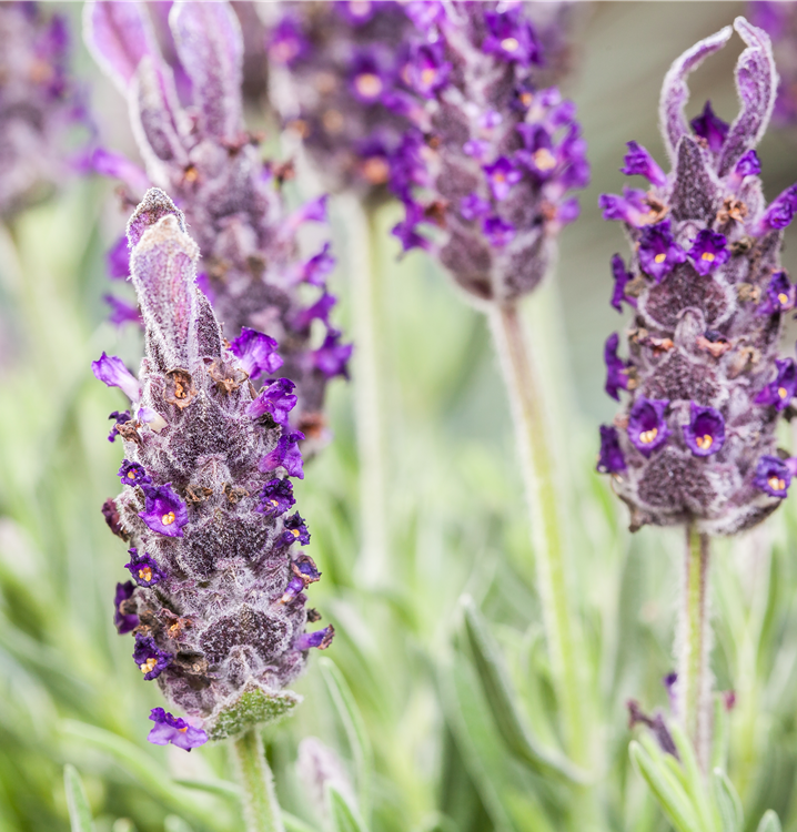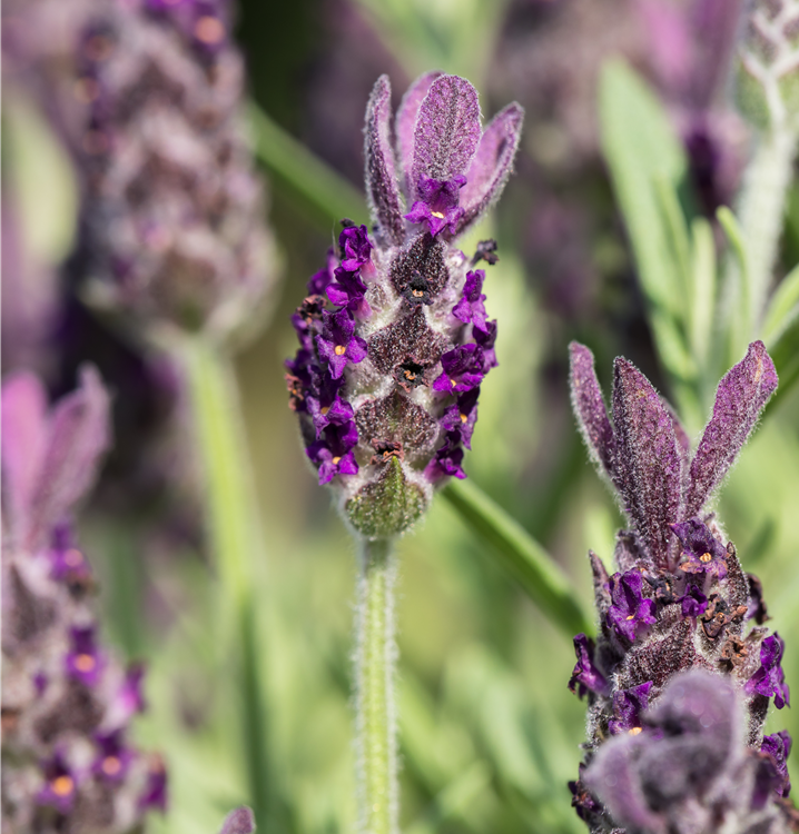 Lavandula stoechas 'Anouk' bildet lilafarbene Blüten ab Mai. Diese verströmen einen angenehmen Duft.