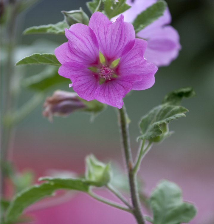 Lavatera x olbia bildet schalenförmige, rosafarbene, weiße, lilafarbene Blüten ab Juni. Diese werden etwa 5 - 10 cm groß.