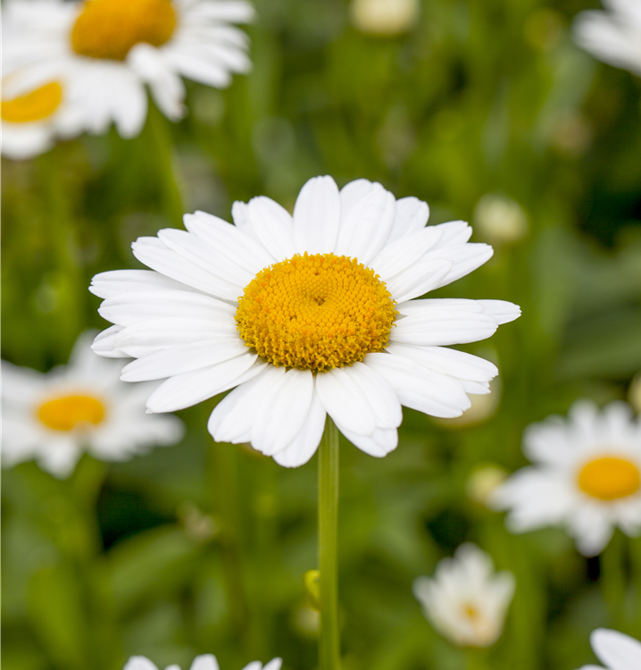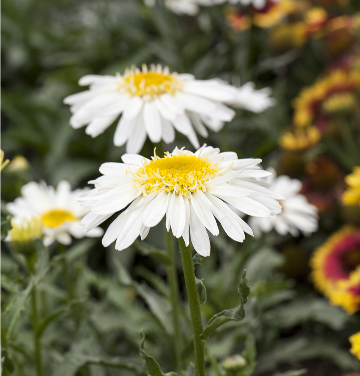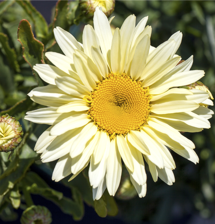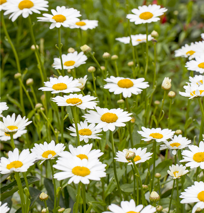 Die Großblumige Garten-Margerite (Leucanthemum x superbum) ist eine aufrechte Staude, die von Juli bis August weiße Blüten mit einem angenehmen Duft bildet. Ihre lanzettlichen Blätter sind dunkelgrün. An einem sonnigen Standort mit durchlässigem, nährstoffreichem Boden erreicht sie gewöhnlich eine Höhe von ca. 1 m und wird ca. 50 cm breit. Die Großblumige Garten-Margerite ist gut frostverträglich.