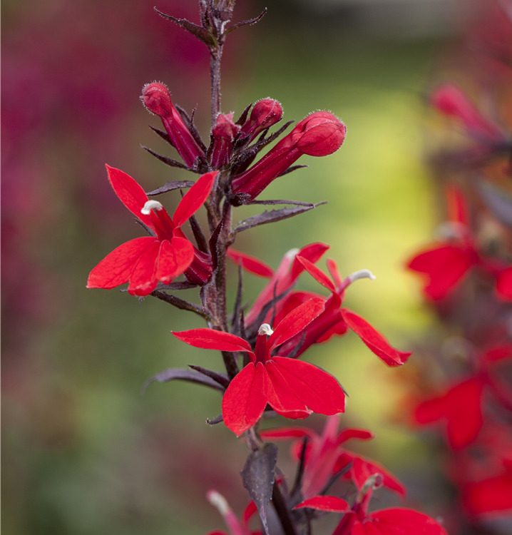 Lobelia x speciosa bildet rote, purpurrote, violette Blüten ab August.