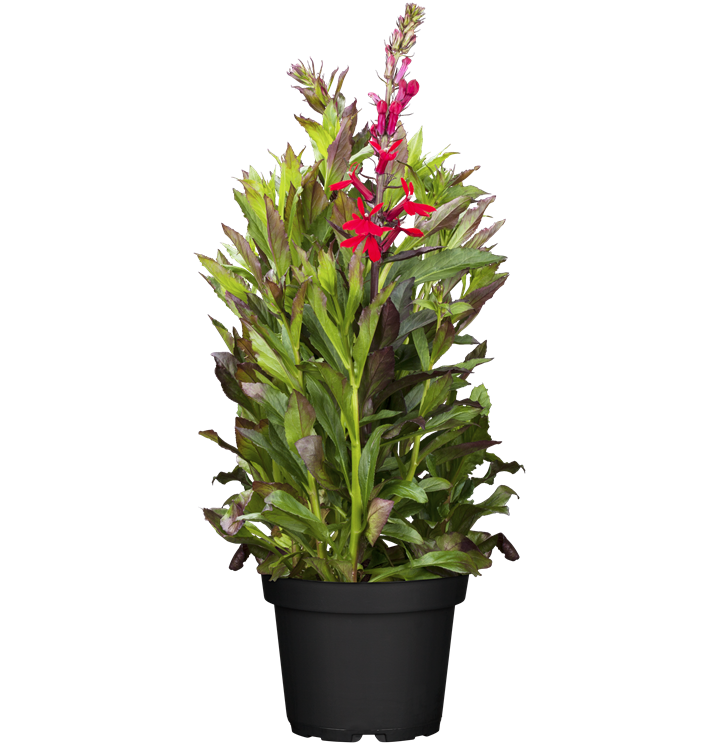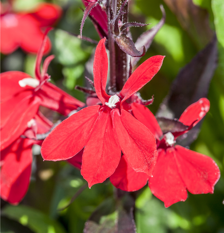 Die Lobelie (Lobelia x speciosa) ist eine aufrechte Staude, die von August bis September rote, purpurrote oder violette Blüten bildet. Ihre lanzettlichen Blätter sind mittelgrün. An einem sonnigen bis halbschattigen Standort mit durchlässigem, nährstoffreichem Boden erreicht sie gewöhnlich eine Höhe von ca. 1,2 m und wird ca. 80 cm breit. Die Lobelie ist gut frostverträglich.