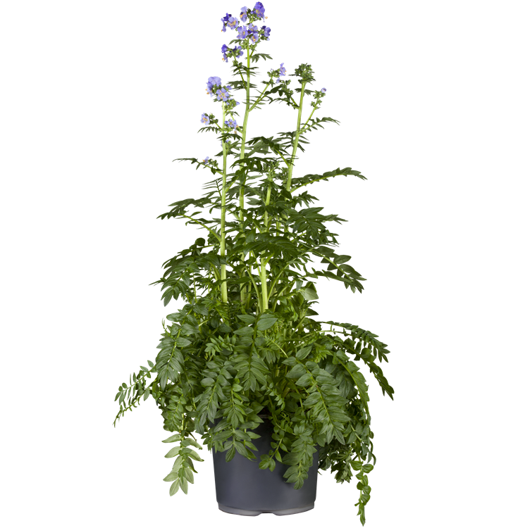 Die Blaublühende Jakobsleiter (Polemonium caeruleum) ist eine aufrechte Staude, die von Mai bis Juni blaue, trichterförmige Blüten mit einem angenehmen Duft bildet. Wiederholte Blüte kommt bei richtiger Pflege von Juli bis August vor. Ihre gefiederten Blätter sind mittelgrün. An einem sonnigen bis halbschattigen Standort mit humosem, nährstoffreichem Boden erreicht sie gewöhnlich eine Höhe von ca. 80 cm und wird ca. 40 cm breit. Die Blaublühende Jakobsleiter ist gut frostverträglich.
